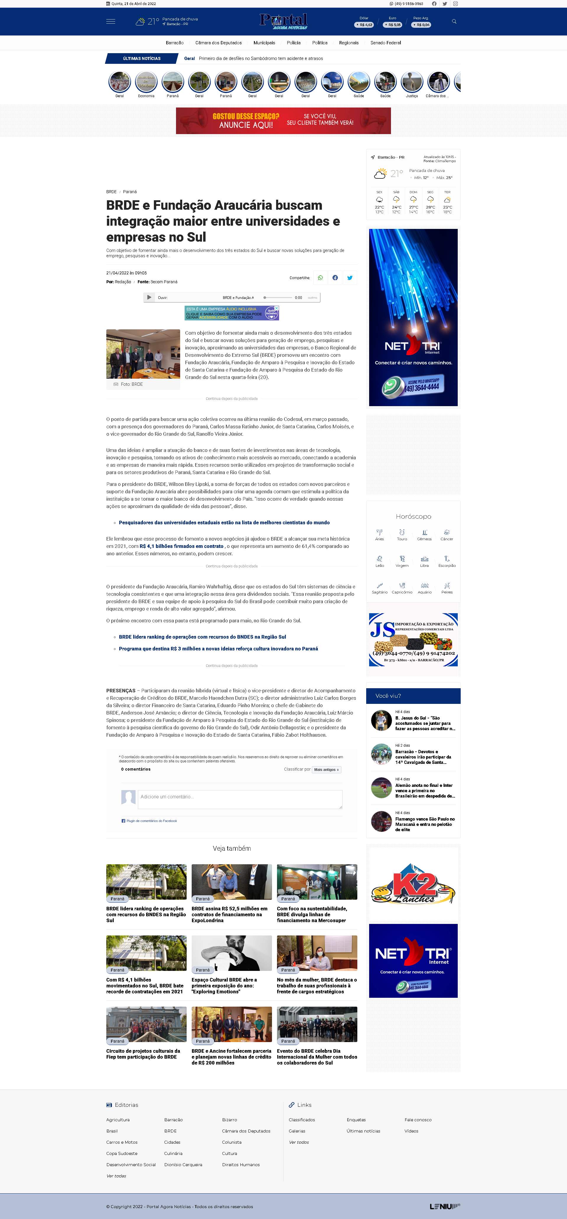 Fundação Araucária abre possibilidades para criar uma agenda comum que estimula a política da instituição a se tornar o maior banco de desenvolvimento do País. "Isso ocorre de verdade quando nossas ações se aproximam da qualidade de vida das pessoas”, disse. Pesquisadores das universidades estaduais estão na lista de melhores cientistas do mundo Ele lembrou que esse processo de fomento a novos negócios já ajudou o