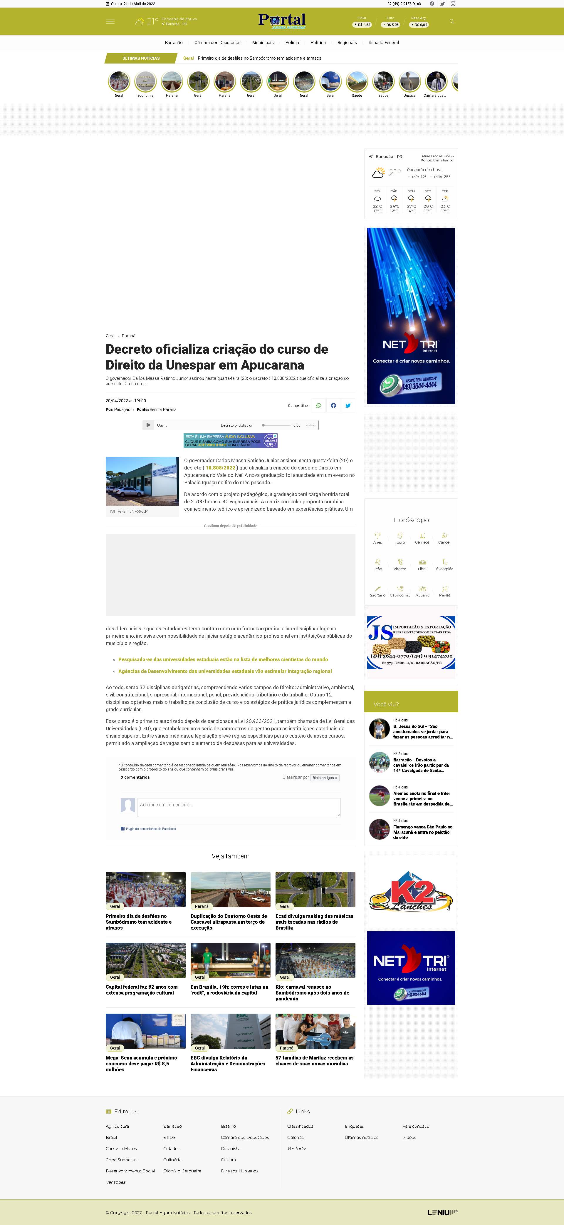 governador Carlos Massa Ratinho Junior assinou nesta quarta-feira (20) o decreto ( 10.808/2022 ) que oficializa a criação do curso de Direito em Apucarana, no Vale do Ivaí. A nova graduação foi anunciada em um evento no