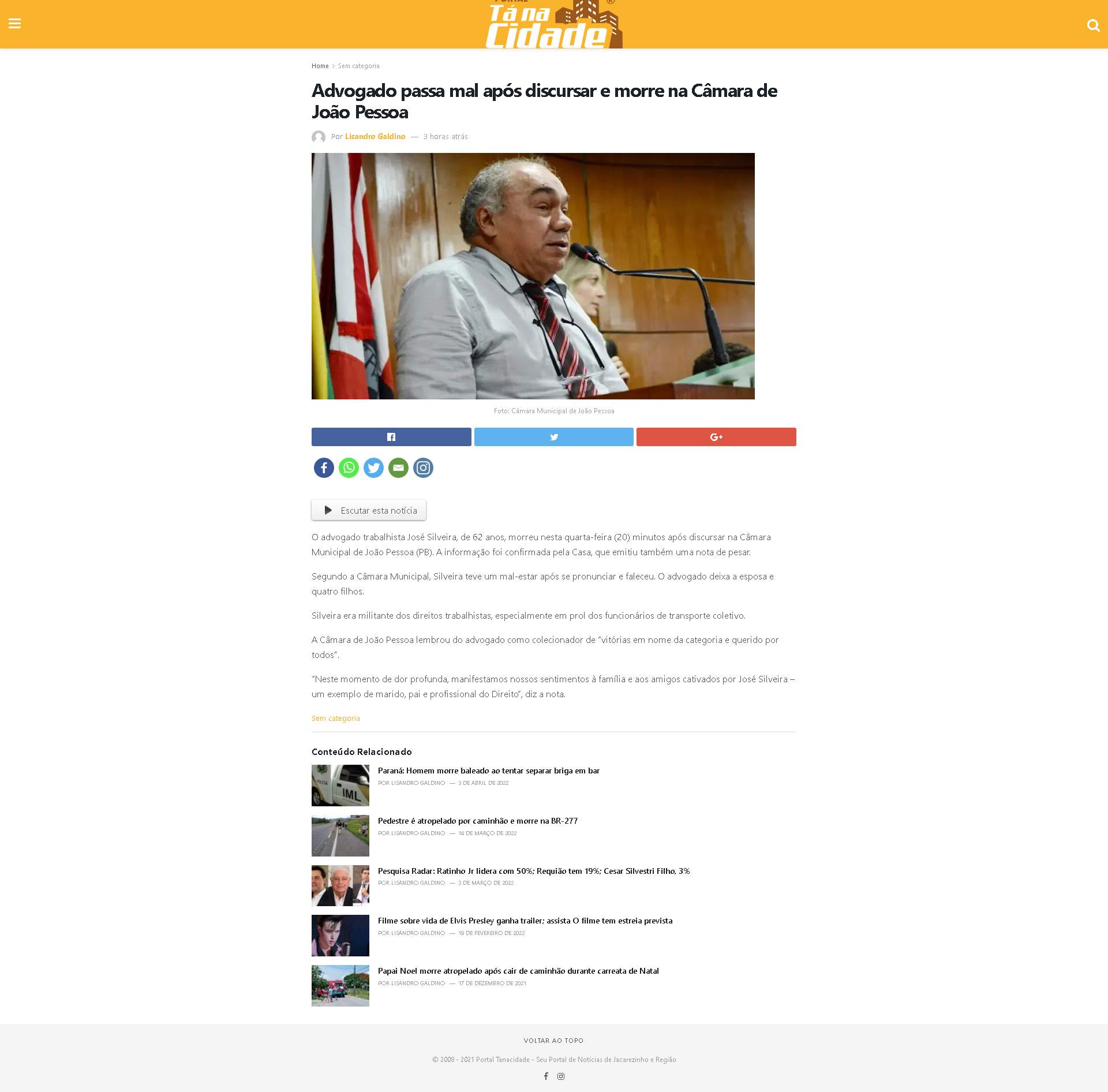 O advogado trabalhista José Silveira, de 62 anos, morreu nesta quarta-feira (20) minutos após discursar na Câmara Municipal de João Pessoa (PB). A informação foi confirmada pela Casa, que emitiu também uma nota de pesar.
