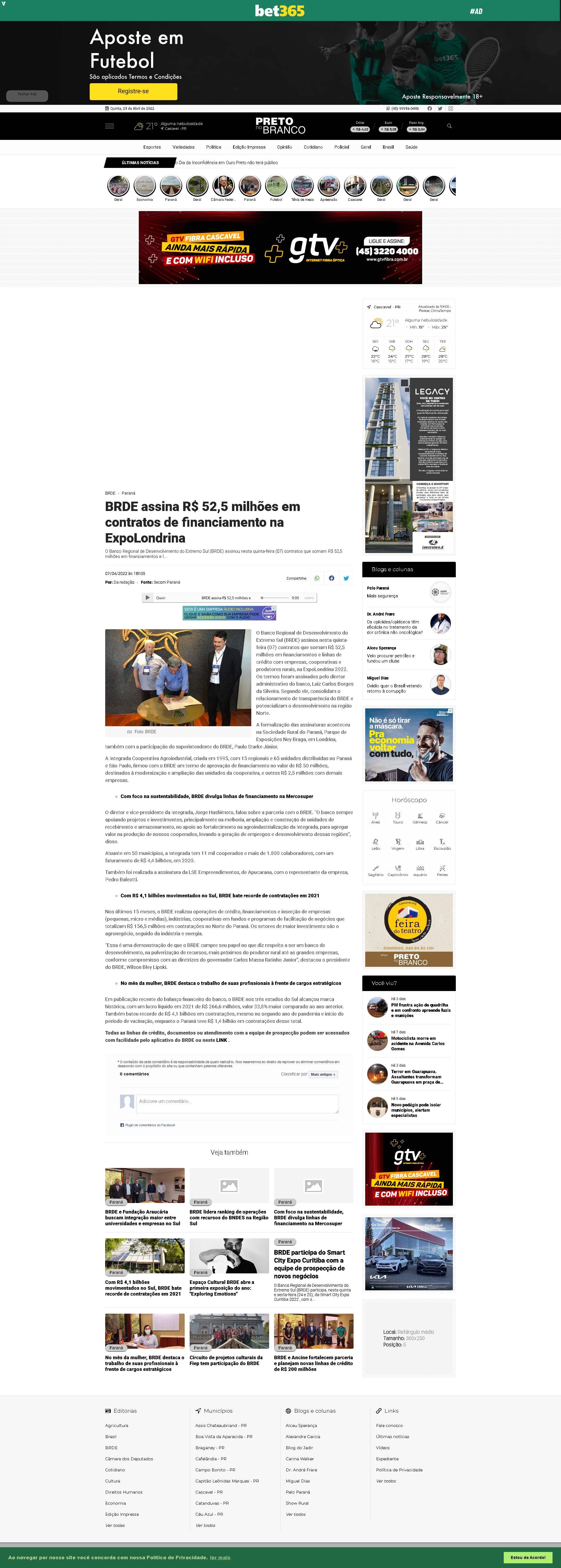 BRDE) assinou nesta quinta-feira (07) contratos que somam R$ 52,5 milhões em financiamentos e linhas de crédito com empresas, cooperativas e produtores rurais, na ExpoLondrina 2022. Os termos foram assinados pelo diretor administrativo do banco, Luiz Carlos Borges da Silveira. Segundo ele, consolidam o relacionamento de transparência do