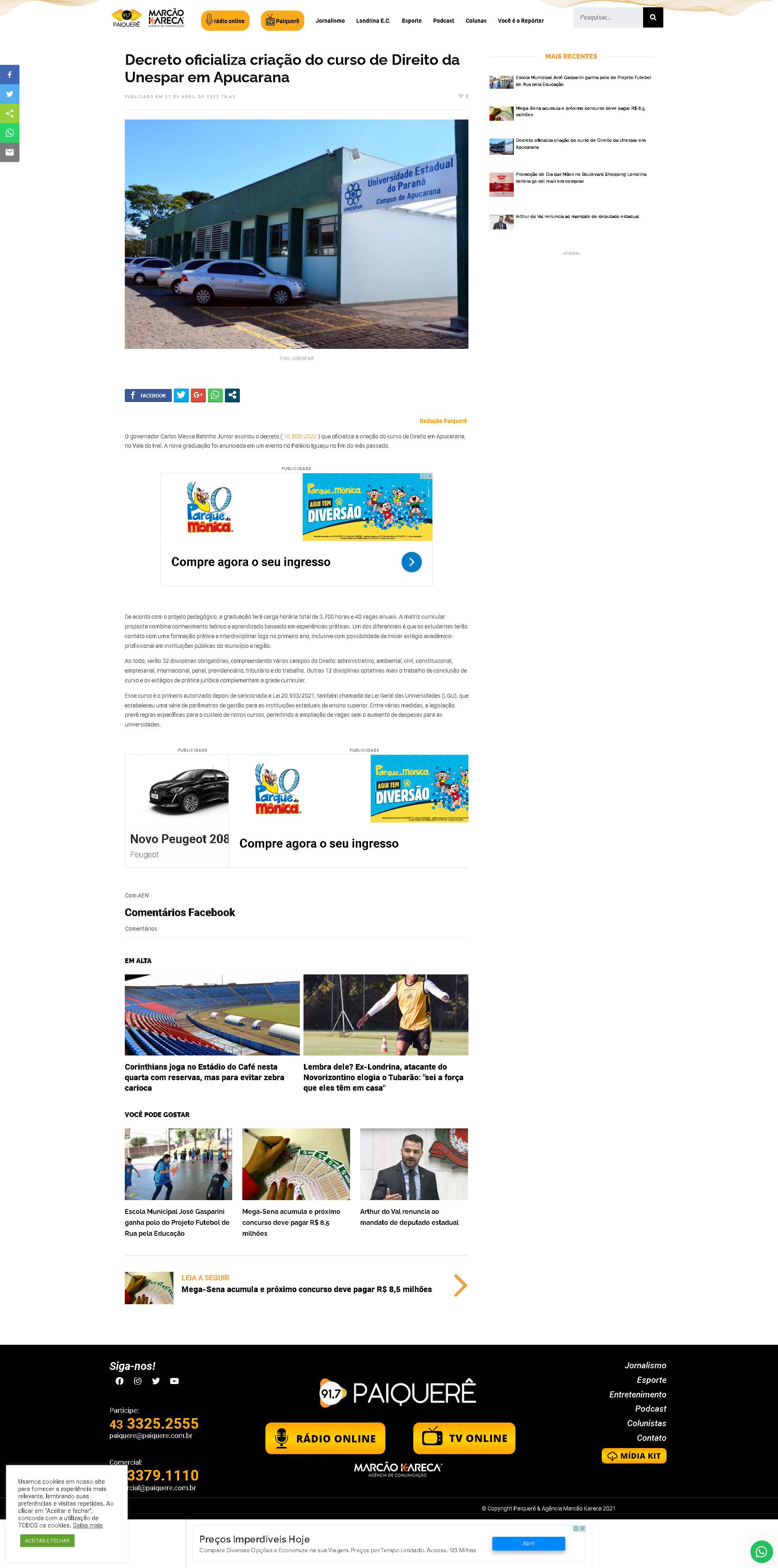 governador Carlos Massa Ratinho Junior assinou o decreto ( 10.808/2022 ) que oficializa a criação do curso de Direito em Apucarana, no Vale do Ivaí. A nova graduação foi anunciada em um evento no