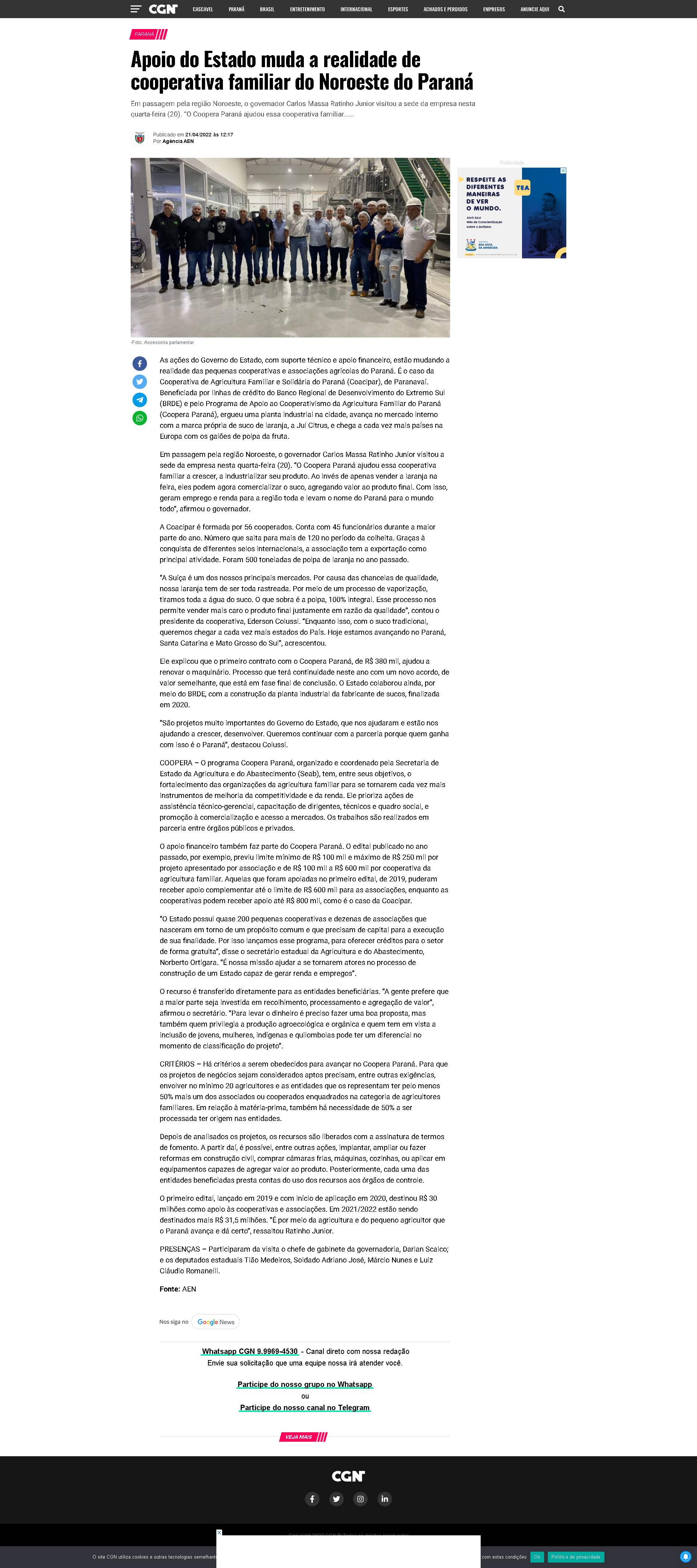 governador Carlos Massa Ratinho Junior visitou a sede da empresa nesta quarta-feira (20). “O Coopera
