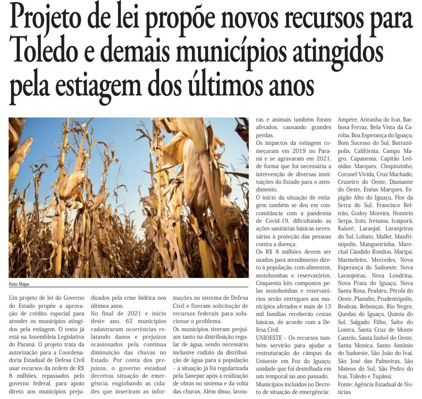 Um projeto de lei do Governo do Estado propõe a aprovação de crédito especial para atender os municípios atingidos pela estiagem. O texto já está na Assembleia Legislativa do Paraná. O projeto trata da autorização para a Coordenadoria Estadual de Defesa Civil usar recursos da ordem de R$ 8 milhões, repassados pelo governo federal, para apoio direto aos municípios prejudicados pela crise hídrica nos últimos anos. No final de 2021 e início deste ano, 62 municípios cadastraram ocorrências relatando danos e prejuízos ocasionados pela contínua diminuição das chuvas no Estado. Por conta dos prejuízos, o governo estadual decretou situação de emergência, englobando as cidades que inseriram as informações no sistema de Defesa Civil e fizeram solicitação de recursos federais para solucionar o problema. Os municípios tiveram prejuízos tanto na distribuição regular de água, sendo necessário inclusive rodízio da distribuição de água para a população – a situação já foi regularizada pela Sanepar após a realização de obras no sistema e da volta das chuvas. Além disso, lavouras e animais também foram afetados, causando grandes perdas. Os impactos da estiagem começaram em 2019 no Paraná e se agravaram em 2021, de forma que foi necessária a intervenção de diversas instituições do Estado para o atendimento. O início da situação de estiagem também se deu em concomitância com a pandemia de Covid-19, dificultando as ações sanitárias básicas necessárias à proteção das pessoas contra a doença. Os R$ 8 milhões devem ser usados para atendimento direto à população, com alimentos, motobombas e reservatórios. Cinquenta kits compostos pelas motobombas e reservatórios serão entregues aos municípios afetados e mais de 13 mil famílias receberão cestas básicas, de acordo com a Defesa Civil. UNIOESTE – Os recursos também servirão para ajudar a restruturação do câmpus da Unioeste em Foz do Iguaçu, unidade que foi destelhada em um temporal no ano passado. Municípios incluídos no Decreto de situação de emergência: Ampére, Ariranha do Ivaí, Barbosa Ferraz, Bela Vista da Caroba, Boa Esperança do Iguaçu, Bom Sucesso do Sul, Borrazópolis, Califórnia, Campo Magro, Capanema, Capitão Leônidas Marques, Chopinzinho, Coronel Vivida, Cruz Machado, Cruzeiro do Oeste, Diamante do Oeste, Enéas Marques, Espigão Alto do Iguaçu, Flor da Serra do Sul, Francisco Beltrão, Godoy Moreira, Honório Serpa, Irati, Iretama, Ivaiporã, Kaloré, Laranjal, Laranjeiras do Sul, Lobato, Mallet, Manfrinópolis, Mangueirinha, Marechal Cândido Rondon, Maripá, Marmeleiro, Mercedes, Nova Esperança do Sudoeste, Nova Laranjeiras, Nova Londrina, Nova Prata do Iguaçu, Nova Santa Rosa, Peabiru, Pérola do Oeste, Planalto, Prudentópolis, Realeza, Rebouças, Rio Negro, Quedas do Iguaçu, Quinta do Sol, Salgado Filho, Salto do Lontra, Santa Cruz de Monte Castelo, Santa Izabel do Oeste, Santa Monica, Santo Antônio do Sudoeste, São João do Ivaí, São José das Palmeiras, São Mateus do Sul, São Pedro do Ivaí, Toledo e Tupãssi. Fonte: Agência Estadual de Notícias