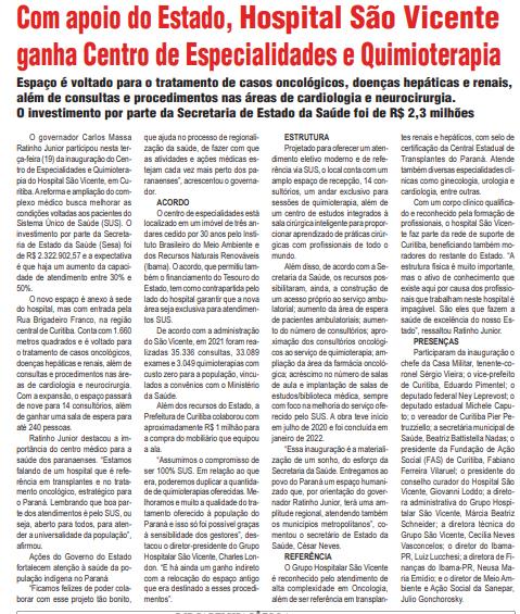 O governador Carlos Massa Ratinho Junior participou nesta terça-feira (19) da inauguração do Centro de Especialidades e Quimioterapia do Hospital São Vicente, em Curitiba. A reforma e ampliação do complexo médico busca melhorar as condições voltadas aos pacientes do Sistema Único de Saúde (SUS). O investimento por parte da Secretaria de Estado da Saúde (Sesa) foi de R$ 2.322.902,57 e a expectativa é que haja um aumento da capacidade de atendimento entre 30% e 50%. O novo espaço é anexo à sede do hospital, mas com entrada pela Rua Brigadeiro Franco, na região central de Curitiba. Conta com 1.660 metros quadrados e é voltado para o tratamento de casos oncológicos, doenças hepáticas e renais, além de consultas e procedimentos nas áreas de cardiologia e neurocirurgia. Com a expansão, o espaço passará de nove para 14 consultórios, além de ganhar uma sala de espera para até 240 pessoas. Ratinho Junior destacou a importância do centro médico para a saúde dos paranaenses. “Estamos falando de um hospital que é referência em transplantes e no tratamento oncológico, estratégico para o Paraná. Lembrando que boa parte dos atendimentos é pelo SUS, ou seja, aberto para todos, para atender a universalidade da população”, afirmou. Ações do Governo do Estado fortalecem atenção à saúde da população indígena no Paraná “Ficamos felizes de poder colaborar com esse projeto tão bonito,que ajuda no processo de regionalização da saúde, de fazer com que as atividades e ações médicas estejam cada vez mais perto dos paranaenses”, acrescentou o governador. ACORDO O centro de especialidades está localizado em um imóvel de três andares cedido por 30 anos pelo Instituto Brasileiro do Meio Ambiente e dos Recursos Naturais Renováveis (Ibama). O acordo, que permitiu também o financiamento do Tesouro do Estado, tem como contrapartida pelo lado do hospital garantir que a nova área seja exclusiva para atendimentos SUS. De acordo com a administração do São Vicente, em 2021 foram realizadas 35.336 consultas, 33.089 exames e 3.049 quimioterapias com custo zero para a população, vinculados a convênios com o Ministério da Saúde. Além dos recursos do Estado, a Prefeitura de Curitiba colaborou com aproximadamente R$ 1 milhão para a compra do mobiliário que equipou a ala. “Assumimos o compromisso de ser 100% SUS. Em relação ao que era, poderemos duplicar a quantidade de quimioterapias oferecidas. Melhoramos e muito a qualidade do tratamento oferecido à população do Paraná e isso só foi possível graças à sensibilidade dos gestores”, destacou o diretor-presidente do Grupo Hospitalar São Vicente, Charles London. “E há ainda um ganho indireto com a relocação do espaço antigo que era destinado a esses procedimentos”. ESTRUTURA Projetado para oferecer um atendimento eletivo moderno e de referência via SUS, o local conta com um amplo espaço de recepção, 14 consultórios, um andar exclusivo para sessões de quimioterapia, além de um centro de estudos integrados à sala cirúrgica inteligente para proporcionar aprendizado de práticas cirúrgicas com profissionais de todo o mundo. Além disso, de acordo com a Secretaria da Saúde, os recursos possibilitaram, ainda, a construção de um acesso próprio ao serviço ambulatorial; aumento da área de espera de pacientes ambulatoriais; aumento do número de consultórios; aproximação dos consultórios oncológicos ao serviço de quimioterapia; ampliação da área da farmácia oncológica; acréscimo no número de salas de aula e implantação de salas de estudos/biblioteca médica, sempre com foco na melhoria do serviço oferecido pelo SUS. A obra teve início em julho de 2020 e foi concluída em janeiro de 2022. “Essa inauguração é a materialização de um sonho, do esforço da Secretaria da Saúde. Entregamos ao povo do Paraná um espaço humanizado que, por orientação do governador Ratinho Junior, terá uma amplitude regional, atendendo também os municípios metropolitanos”, comentou o secretário de Estado da Saúde, César Neves. REFERÊNCIA O Grupo Hospitalar São Vicente é reconhecido pelo atendimento de alta complexidade em Oncologia, além de ser referência em transplantes renais e hepáticos, com selo de certificação da Central Estadual de Transplantes do Paraná. Atende também diversas especialidades clínicas como ginecologia, urologia e cardiologia, entre outras. Com um corpo clínico qualificado e reconhecido pela formação de profissionais, o hospital São Vicente faz parte da rede de suporte de Curitiba, beneficiando também moradores do restante do Estado. “A estrutura física é muito importante, mas o ativo de conhecimento que existe aqui por causa dos profissionais que trabalham neste hospital é impagável. São eles que fazem a saúde de excelência do nosso Estado”, ressaltou Ratinho Junior. PRESENÇAS Participaram da inauguração o chefe da Casa Militar, tenente-coronel Sérgio Vieira; o vice-prefeito de Curitiba, Eduardo Pimentel; o deputado federal Ney Leprevost; o deputado estadual Michele Caputo; o vereador de Curitiba Pier Petruzziello; a secretária municipal de Saúde, Beatriz Battistella Nadas; o presidente da Fundação de Ação Social (FAS) de Curitiba, Fabiano Ferreira Vilaruel; o presidente do conselho curador do Hospital São Vicente, Giovanni Loddo; a diretora administrativa do Grupo Hospitalar São Vicente, Márcia Beatriz Schneider; a diretora técnica do Grupo São Vicente, Cecília Neves Vasconcelos; o diretor do IbamaPR, Luiz Lucchesi; a diretora de Finanças do Ibama-PR, Neusa Maria Emídio; e o diretor de Meio Ambiente e Ação Social da Sanepar, Julio Gonchorosky