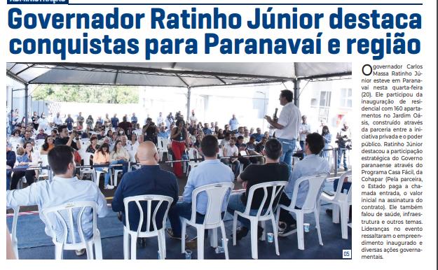 O governador Carlos Massa Ratinho Júnior esteve em Paranavaí nesta quarta-feira (20). Ele participou da inauguração de residencial com 160 apartamentos no Jardim Oásis, construído através da parceria entre a iniciativa privada e o poder público. Ratinho Júnior destacou a participação estratégica do Governo paranaense através do Programa Casa Fácil, da Cohapar (Pela parceira, o Estado paga a chamada entrada, o valor inicial na assinatura do contrato). Ele também falou de saúde, infraestrutura e outros temas. Lideranças no evento ressaltaram o empreendimento inaugurado e diversas ações governamentais.