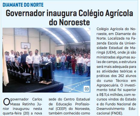 O governador Carlos Massa Ratinho Junior inaugurou nesta quarta-feira (20) a nova sede do Centro Estadual de Educação Profissional (CEEP) do Noroeste, também conhecido como Colégio Agrícola do Noroeste, em Diamante do Norte. Localizada na Fazenda Escola da Universidade Estadual de Maringá (UEM), onde já são ministradas algumas aulas de campo, a estrutura será mais adequada para as atividades teóricas e práticas dos 262 alunos do curso Técnico em Agropecuária. O investimento total foi superior a R$ 11,4 milhões, com recursos vindos do Estado e do Fundo Nacional de Desenvolvimento Educacional (FNDE).