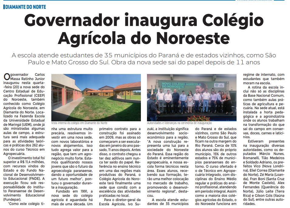 O governador Carlos Massa Ratinho Junior inaugurou nesta quarta- -feira (20) a nova sede do Centro Estadual de Educação Profi ssional (CEEP) do Noroeste, também conhecido como Colégio Agrícola do Noroeste, em Diamante do Norte. Localizado na Fazenda Escola da Universidade Estadual de Maringá (UEM), onde já são ministradas algumas aulas de campo, a estrutura será mais adequada para as atividades teóricas e práticas dos 262 alunos do curso Técnico em Agropecuária. O investimento total foi superior a R$ 11,4 milhões, com recursos vindos do Estado e do Fundo Nacional de Desenvolvimento Educacional (FNDE). A execução fi cou sob responsabilidade do Instituto Paranaense de Desenvolvimento Educacional (Fundepar). “Como este colégio tinha uma estrutura muito precária, resolvemos investir em uma nova sede, com novos laboratórios e novos alojamentos. Isso tudo agrega valor para a região, que tem um agronegócio muito forte. Estamos qualifi cando nossos jovens que são o futuro da agroecologia paranaense, dando a oportunidade de um futuro melhor”, pontuou o governador durante a inauguração. Fundado em 1991, a nova sede do colégio agrícola é aguardada há mais de uma década. Um primeiro contrato para a construção foi assinado em 2009, mas as obras só começaram a ser executadas em janeiro do ano passado, 11 anos depois. Antes disso, o contrato chegou a ter dez aditivos sem nunca ter saído do papel. Referência no ensino técnico em uma das regiões mais produtivas do Paraná, o Colégio Agrícola do Noroeste terá fi nalmente uma sede que condiz com a excelência das atividades praticadas no local. Para o diretor-geral da Escola Agrícola, Ivo Suzuki, a instituição signifi ca desenvolvimento socioeconômico para a região. “A nova construção representa uma luz para a sociedade do Noroeste do Paraná. Essa região do Estado é eminentemente agropecuária, e nossa escola forma técnicos nesta área. Esses alunos, recebendo sua formação, terão uma melhor colocação no mercado de trabalho, promovendo o desenvolvimento regional”, destacou. A escola atende estudantes de 35 municípios do Paraná e de estados vizinhos, como São Paulo e Mato Grosso do Sul, que fi cam na outra margem do Rio Paraná. Cerca de 10% dos alunos são do próprio município, 15% de outros estados e 75% de municípios paranaenses do entorno. O curso ofertado é o de Técnico em Agropecuária Integrado, com disciplinas do Ensino Médio regular e práticas do ensino profi ssional, atendendo em período integral. Assim como a maioria dos colégios agrícolas do Estado, o do Noroeste funciona em regime de internato, com estudantes que também moram na escola. A rotina da escola inclui não só as disciplinas da Base Nacional Comum, como também aulas práticas de agricultura e pecuária. Na sede atual, está instalada a horta pedagógica e a agroindústria onde os alunos trabalham na transformação do que sai do campo em conservas, doces, carnes e laticínios. Estiveram presentes na inauguração diversas autoridades, como os deputados Márcio Nunes, Romanelli, Tião Medeiros e Soldado Adriano, os prefeitos Vico (Nova Londrina), Eliel Correa (Diamante do Norte), Zé Maria (Loanda), Fran Boni (Santa Cruz de Monte Castelo), Alex Fernandes (Querência do Norte), Júlio Leite (Terra Rica) e Gilson Góis (Itaúna do Sul), entre outras autoridades.
