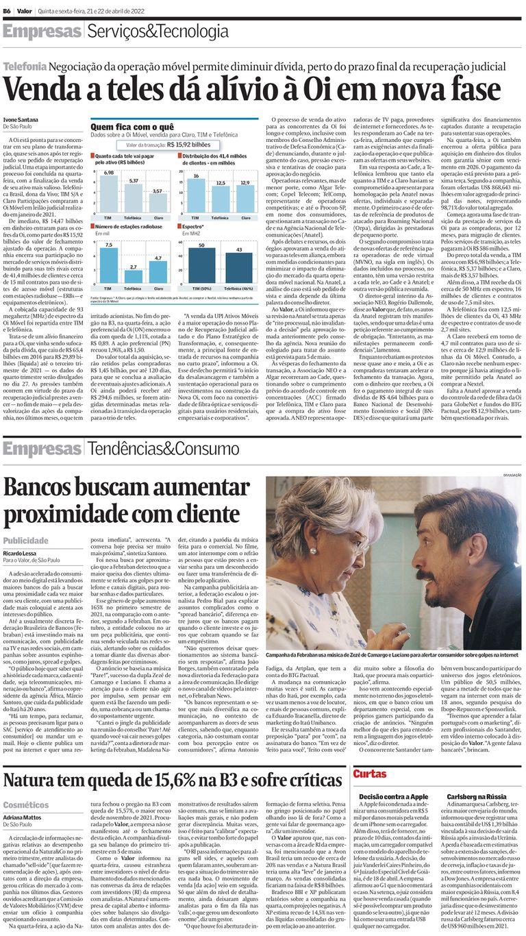 Trata-se de um alívio financeiro para a Oi, que vinha sendo sufocada pela dívida, que caiu de R$ 65,4 bilhões em 2016 para R$ 29,89 bilhões (líquida) até o terceiro trimestre de 2021 - os dados do quarto trimestre serão divulgados no dia 27. As pressões também ocorrem em virtude do prazo da recuperação judicial prestes a vencer - no fim de maio - e pela desvalorização das ações da companhia, nos últimos meses, o que tem irritado acionistas. No fim do pregão na B3, na quarta-feira, a ação preferencial da Oi (ON) encerrou o dia com queda de 1,11%, cotada a R$ 0,89. A ação preferencial (PN) recuou 1,96%, a R$ 1,50.