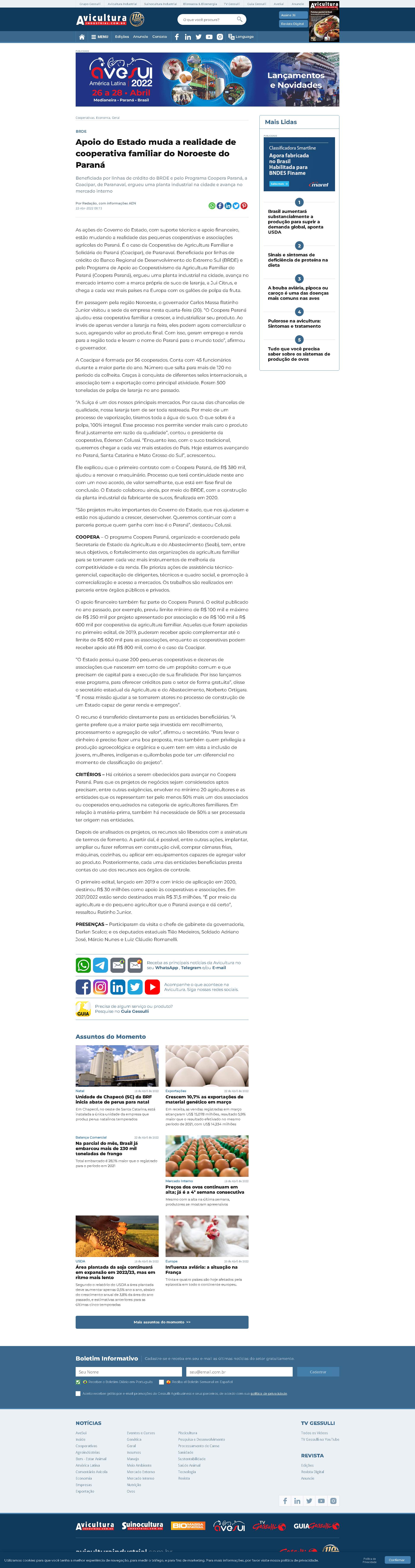 Paraná. O edital publicado no ano passado, por exemplo, previu limite mínimo de R$ 100 mil e máximo de R$ 250 mil por projeto apresentado por associação e de R$ 100 mil a R$ 600 mil por cooperativa da agricultura familiar. Aquelas que foram apoiadas no primeiro edital, de 2019, puderam receber apoio complementar até o limite de R$ 600 mil para as associações, enquanto as cooperativas podem receber apoio até R$ 800 mil, como é o caso da Coacipar.