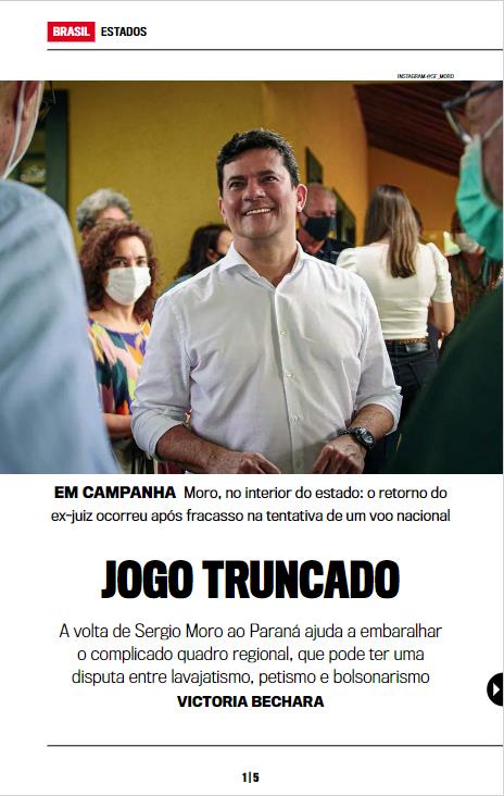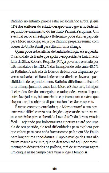Bolsonaro, inimigos declarados. Se não conseguir, o estado pode ter uma disputa entre lavajatismo, bolsonarismo e petismo, um cenário que chegou a se desenhar na disputa nacional e não prosperou. É nesse contexto enrolado que Moro tentará a sua con- troversa e difícil estreia nas eleições. Apesar de estar em casa, o caminho para o “herói da Lava-Jato” não deve ser nada fácil — rejeitado por bolsonaristas e petistas e até por uma ala de seu partido, ele terá dificuldades para explicar por que voltou para casa após fracassos no país e em São Paulo para lançar uma candidatura. O apoio maciço das ruas não existe mais e o ex-juiz, que se destacou até aqui por movimentações desastradas na política, terá de se mostrar agora um craque nesse campo para virar o jogo a tempo.