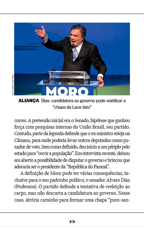 Ratinho. A entrada de Dias ou de Moro na disputa ao go- verno racharia o eleitorado de centro-direita e elevaria a pos- sibilidade de segundo turno.