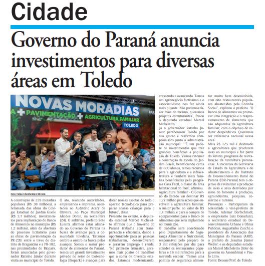 onstrução de 228 moradias populares (R$ 38 milhões), a retomada das obras do Colégio Estadual do Jardim Gisele (R$ 3,7 milhões), investimentos para implantação do Banco de Alimentos no município (R$ 1,2 milhão), além da abertura do processo licitatório para as obras de pavimentação da PR-239, entre o trevo do distrito de Bragantina e a PR-182, nas proximidades do Biopark, foram anunciadas pelo governador Ratinho Júnior durante visita ao município de Toledo. O ato, reunindo autoridades, empresários e imprensa, aconteceu no Auditório Acary de Oliveira, no Paço Municipal Alcides Donin, na sexta-feira (24). O anfitrião, prefeito Beto Lunitti, afirmou estar alinhado ao Governo do Paraná na busca de avanços para a comunidade toledana.