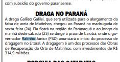 A draga Galileo Galilei, que será utilizada para o alargamento da faixa de areia de Matinhos, chegou ao Paraná na madrugada de sexta-feira (24). Ela ficará na região de Paranaguá e ao longo da manhã deste sábado (25) se dirige à praia de Caiobá, onde o governador Ratinho Júnior (PSD) anunciará o início do processo de dragagem no Litoral. A dragagem é um dos processos das Obras de Recuperação da Orla de Matinhos, com investimentos de R$ 314,9 milhões.