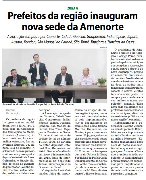 Os prefeitos da região inauguraram na manhã desta sexta-feira, 24, a nova sede da Associação dos Municípios do Médio Noroeste (Amenorte). O local, mais amplo e com melhor estrutura, fica na Avenida Europa, 26, na Zona Seis de Cianorte. A solenidade de inauguração contou com a presença dos deputados estaduais Jonas Guimarães e Marcio Nunes, do chefe de gabinete do governador Ratinho Junior, Darlan Scalco, além de prefeitos e lideranças da região. A Associação composta por Cianorte, Cidade Gaúcha, Guaporema, Indianópolis, Japurá, Jussara, Rondon, São Manoel do Paraná, São Tomé, Tapejara e Tuneiras do Oeste, foi criada por meio do projeto de lei de número 11.354/1996, de autoria do então deputado estadual Edno Guimarães, em 1996. Sendo oficializada em 2010 e implementada em 2013, fruto de intermediação do deputado Jonas Guimarães junto ao Governo do Estado. O deputado Jonas Guimarães falou da importância da criação da microrregião à época, tendo realizado um trabalho forte pela implementação. “Antes dependíamos de municípios como Campo Mourão, Umuarama, ou Maringá para inúmeras coisas. Hoje, graças à criação e à existência da nossa microrregião, temos os vários Núcleos em Cianorte, além de conquistarmos a 5ª Companhia Independente da Polícia Militar; Subdivisão da Polícia Civil; Subgrupamento do Corpo de Bombeiros e a construção da sua sede; a Delegacia da Mulher, dentre outros”, disse o deputado.O presidente da Amenorte e prefeito de Tapejara, Rodrigo Pezão, parabenizou o trabalho desempenhado pelos municípios que compõem a Associação e falou sobre o projeto do novo Ciscenop. “O projeto de consorcio multissetorial está em fase final e vai atender não só as compras na área de saúde mais também na infraestrutura, esporte e outros. Juntos teremos mais poder de compra para atender cada vez melhor a nossa população”, comenta. “Essa nova sede vai atender aos prefeitos e as necessidades dos municípios, além das necessidades políticas da nossa região”, completa. Representando o governador Ratinho Junior, o chefe de gabinete Dalan, falou sobre a importância do trabalho dos munícios do médio Noroeste. “Estamos trabalhando para além do nosso mandato, trabalho que vai atingir gerações futuras. Obras que atendem a toda população. A administração precisa pensar em consórcios para impulsionar o poder de compra e garantir mais qualidade em suas parcerias , comentou.