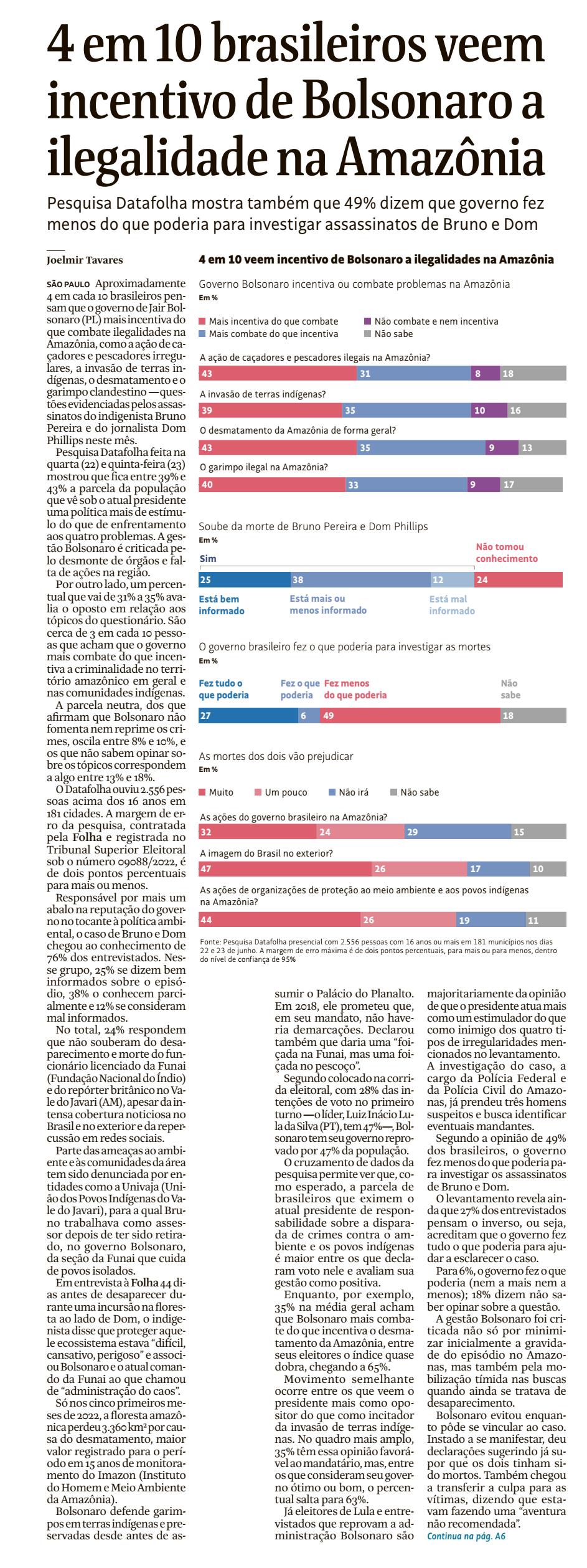 Aproximadamente 4 em cada 10 brasileiros pensam que o governo de Jair Bolsonaro (PL) mais incentiva do que combate ilegalidades na Amazônia como a ação de caçadores e pescadores irregulares, a invasão de terras indígenas, o desmatamento e o garimpo clandestino —questões evidenciadas pelos assassinatos do indigenista Bruno Pereira e do jornalista Dom Phillips neste mês.