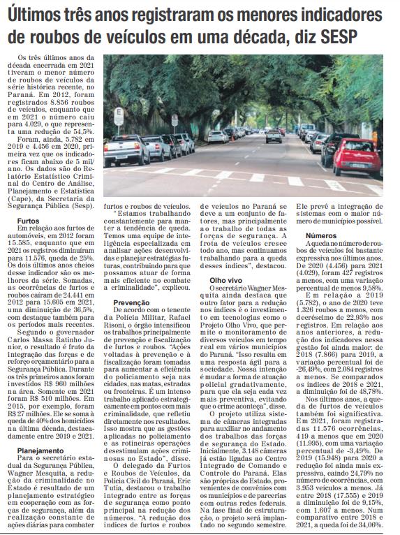 Os três últimos anos da década encerrada em 2021 t iveram o menor número d e roubos de veículos da s érie histórica recente, no P araná. Em 2012, foram r egistrados 8.856 roubos d e veículos, enquanto que e m 2021 o número caiu para 4.029, o que represent a uma redução de 54,5%. Foram, ainda, 5.782 em 2 019 e 4.456 em 2020, primeira vez que os indicador es ficam abaixo de 5 mil/ a no. Os dados são do Rel atório Estatístico Crimin al do Centro de Análise, P lanejamento e Estatística ( Cape), da Secretaria da S egurança Pública (Sesp). Furtos Em relação aos furtos de automóveis, em 2012 foram 1 5.585, enquanto que em 2021 os registros diminuíram para 11.576, queda de 25%. Os dois últimos anos cheios desse indicador são os mel hores da série. Somadas, a s ocorrências de furtos e roubos caíram de 24.441 em 2 012 para 15.605 em 2021, u ma diminuição de 36,5%, com destaque também para o s períodos mais recentes. S egundo o governador C arlos Massa Ratinho Junior, o resultado é fruto da i ntegração das forças e de reforço orçamentário para a Segurança Pública. Durante os três primeiros anos foram i nvestidos R$ 960 milhões n a área. Somente em 2021 f oram R$ 510 milhões. Em 2 015, por exemplo, foram R$ 27 milhões. Ele se soma à queda de 40% dos homicídios n a última década, destacadamente entre 2019 e 2021. Planejamento Para o secretário estadual da Segurança Pública, Wagner Mesquita, a reduç ão da criminalidade no E stado é resultado de um p lanejamento estratégico em cooperação com as forças de segurança, além da r ealização constante de ações diárias para combater furtos e roubos de veículos. “ Estamos trabalhando constantemente para mant er a tendência de queda. Temos uma equipe de intel igência especializada em a nalisar ações desenvolvidas e planejar estratégias futuras, contribuindo para que p ossamos atuar de forma m ais eficiente no combate a criminalidade”, explicou. Prevenção De acordo com o tenente d a Polícia Militar, Rafael Risoni, o órgão intensificou os trabalhos principalmente de prevenção e fiscalização d e furtos e roubos. “Ações v oltadas à prevenção e à fiscalização foram tomadas para aumentar a eficiência d o policiamento seja nas cidades, nas matas, estradas ou fronteiras. É um intenso trabalho aplicado estrategicamente em pontos com mais c riminalidade, que refletiu diretamente nos resultados. Isso mostra que as gestões a plicadas no policiamento e as rotineiras operações desestimulam ações crimin osas no Estado”, disse. O delegado da Furtos e Roubos de Veículos, da Polícia Civil do Paraná, Eric T utia, destacou o trabalho i ntegrado entre as forças d e segurança como ponto p rincipal na redução dos n úmeros. “A redução dos í ndices de furtos e roubos d e veículos no Paraná se d eve a um conjunto de fat ores, mas principalmente a o trabalho de todas as f orças de segurança. A f rota de veículos cresce todo ano, mas continuamos t rabalhando para a queda d esses índices”, destacou. Olho vivo O secretário Wagner Mesq uita ainda destaca que outro fator para a redução nos índices é o investiment o em tecnologias como o Projeto Olho Vivo, que perm ite o monitoramento de diversos veículos em tempo r eal em vários municípios do Paraná. “Isso resulta em u ma resposta ágil para a s ociedade. Nossa intenção é mudar a forma de atuação p olicial gradativamente, para que ela seja cada vez m ais preventiva, evitando que o crime aconteça”, disse. O projeto utiliza sistem a de câmeras integradas para auxiliar no andamento d os trabalhos das forças d e segurança do Estado. Inicialmente, 3.148 câmeras j á estão ligadas ao Centro I ntegrado de Comando e C ontrole do Paraná. Elas são próprias do Estado, provenientes de convênios com os municípios e de parcerias c om outras redes federais. N a fase final de estruturação, o projeto será implantado no segundo semestre. E le prevê a integração de s istemas com o maior número de municípios possível. Números A queda no número de roubos de veículos foi bastante expressiva nos últimos anos. D e 2020 (4.456) para 2021 (4.029), foram 427 registros a menos, com uma variação percentual de menos 9,58%. E m relação a 2019 (5.782), o ano de 2020 teve 1.326 roubos a menos, com d ecréscimo de 22,93% nos r egistros. Em relação aos a nos anteriores, a reduç ão dos indicadores nessa g estão foi ainda maior: de 2 018 (7.866) para 2019, a v ariação percentual foi de -26,49%, com 2.084 registros a menos. Se comparados o s índices de 2018 e 2021, a diminuição foi de 48,78%. Nos últimos anos, a qued a de furtos de veículos t ambém foi significativa. Em 2021, foram registrad as 11.576 ocorrências, 4 19 a menos que em 2020 (11.995), com uma variação p ercentual de -3,49%. De 2 019 (15.948) para 2020 a redução foi ainda mais expressiva, caindo 24,79% no número de ocorrências, com 3.953 veículos a menos. Já entre 2018 (17.555) e 2019 a diminuição foi de 9,15%, c om 1.607 a menos. Num c omparativo entre 2018 e 2021, a queda foi de 34,06%.