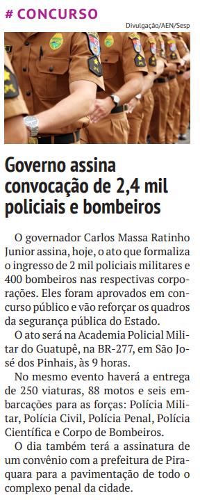 O governador Carlos Massa Ratinho Junior assina, hoje, o ato que formaliza o ingresso de 2 mil policiais militares e 400 bombeiros nas respectivas corporações. Eles foram aprovados em concurso público e vão reforçar os quadros da segurança pública do Estado. O ato será na Academia Policial Militar do Guatupê, na BR-277, em São José dos Pinhais, às 9 horas. No mesmo evento haverá a entrega de 250 viaturas, 88 motos e seis embarcações para as forças: Polícia Militar, Polícia Civil, Polícia Penal, Polícia Científica e Corpo de Bombeiros. O dia também terá a assinatura de um convênio com a prefeitura de Piraquara para a pavimentação de todo o complexo penal da cidade.