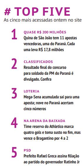 1 QUASE R$ 200 MILHÕES Quina de São João tem 11 apostas vencedoras, uma do Paraná. Cada uma leva R$ 17,8 milhões 2 CLASSIFICADOS Resultado fi nal do concurso para soldado da PM do Paraná é divulgado. Confi ra 3 LOTERIA Mega-Sena acumulada sai para uma aposta; nove no Paraná acertam cinco números 4 NA ARENA DA BAIXADA Time reserva do Athletico marca quatro gols e toma susto no fi m, mas vence o Bragantino por 4 a 2 5 PSD Prefeito Rafael Greca assina fi liação ao partido do governador Ratinho Jr