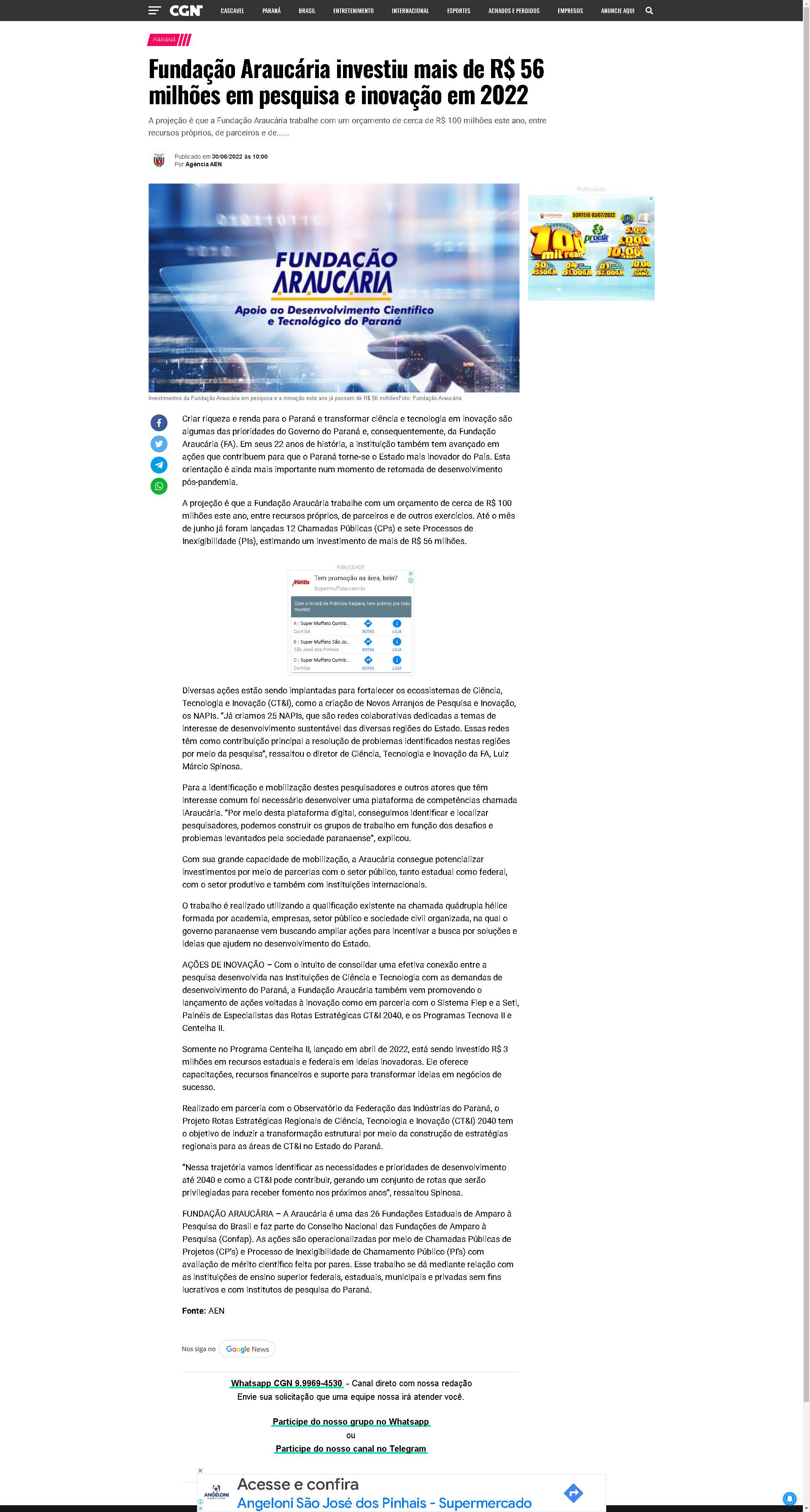 FUNDAÇÃO ARAUCÁRIA - A Araucária é uma das 26 Fundações Estaduais de Amparo à Pesquisa do Brasil e faz parte do Conselho Nacional das Fundações de Amparo à Pesquisa (Confap). As ações são operacionalizadas por meio de Chamadas Públicas de Projetos (CP’s) e Processo de Inexigibilidade de Chamamento Público (PI’s) com avaliação de mérito científico feita por pares. Esse trabalho se dá mediante relação com as instituições de ensino superior federais, estaduais, municipais e privadas sem fins lucrativos e com institutos de pesquisa do Paraná.