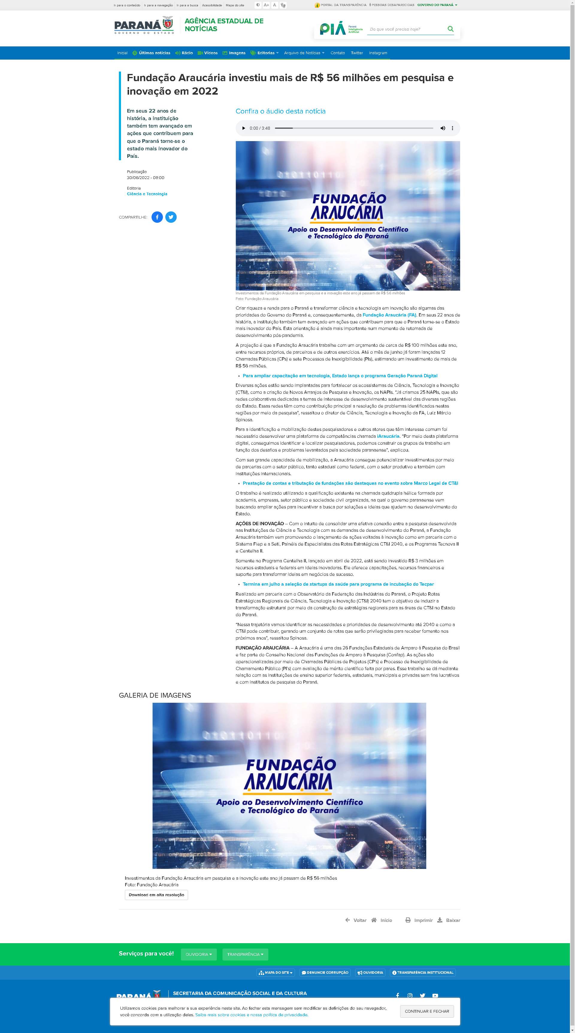 FUNDAÇÃO ARAUCÁRIA - A Araucária é uma das 26 Fundações Estaduais de Amparo à Pesquisa do Brasil e faz parte do Conselho Nacional das Fundações de Amparo à Pesquisa (Confap). As ações são operacionalizadas por meio de Chamadas Públicas de Projetos (CP's) e Processo de Inexigibilidade de Chamamento Público (PI's) com avaliação de mérito científico feita por pares. Esse trabalho se dá mediante relação com as instituições de ensino superior federais, estaduais, municipais e privadas sem fins lucrativos e com institutos de pesquisa do