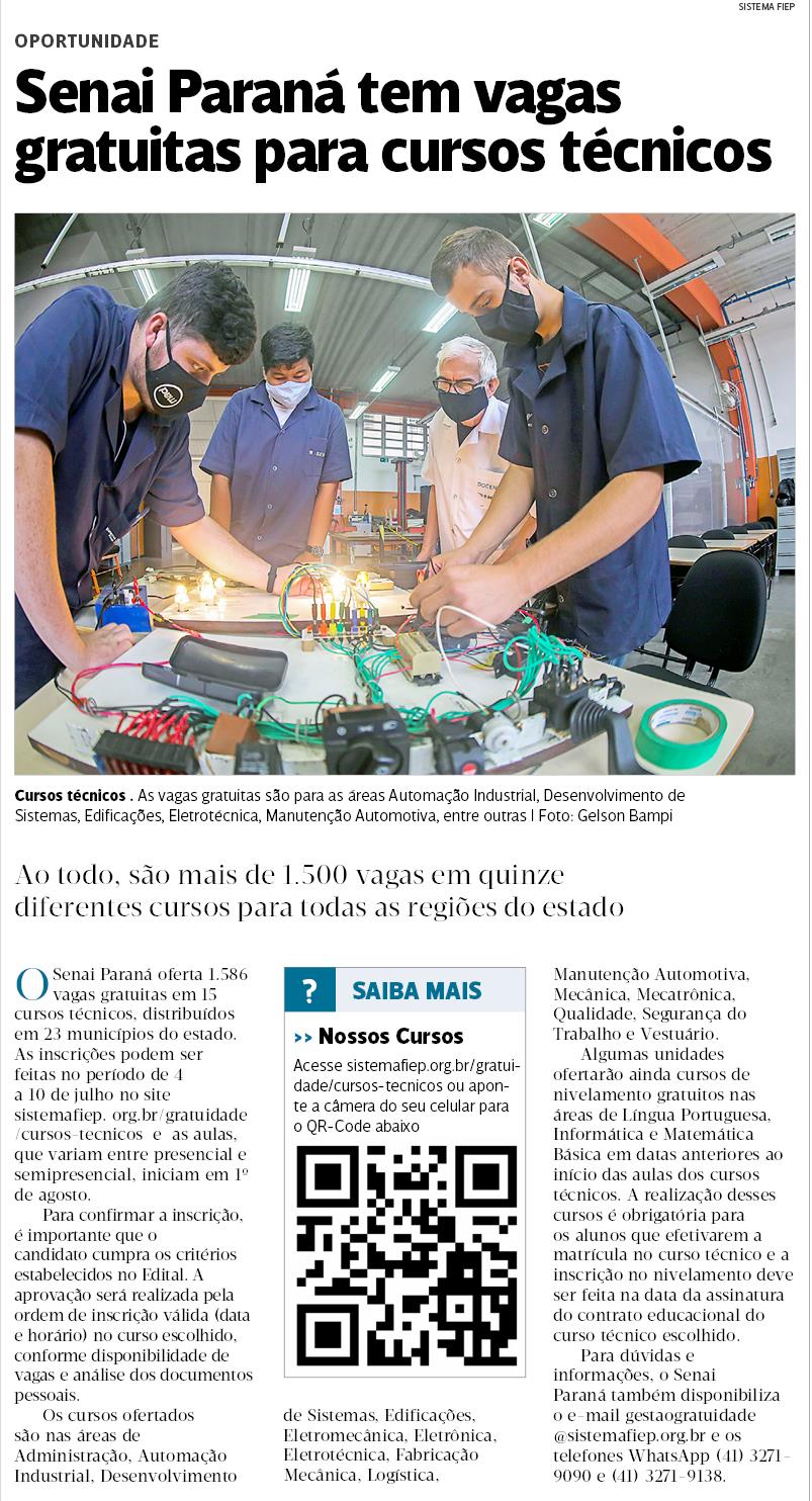 Senai Paraná tem vagas gratuitas para cursos técnicos
