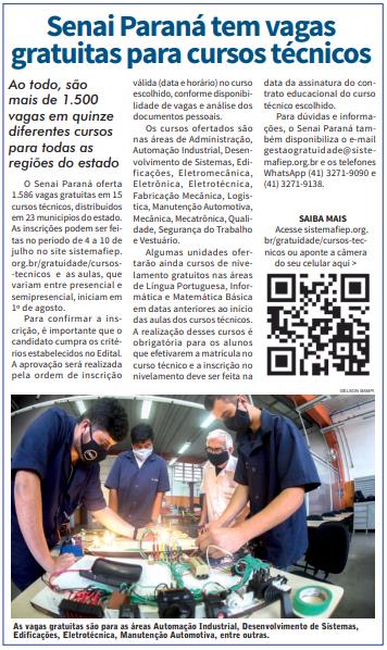 O Senai Paraná oferta 1.586 vagas gratuitas em 15 cursos técnicos, distribuídos em 23 municípios do estado. As inscrições podem ser feitas no período de 4 a 10 de julho no site sistemafiep. org.br/gratuidade/cursos- -tecnicos e as aulas, que variam entre presencial e semipresencial, iniciam em 1º de agosto. Para confirmar a inscrição, é importante que o candidato cumpra os critérios estabelecidos no Edital. A aprovação será realizada pela ordem de inscrição válida (data e horário) no curso escolhido, conforme disponibilidade de vagas e análise dos documentos pessoais. Os cursos ofertados são nas áreas de Administração, Automação Industrial, Desenvolvimento de Sistemas, Edificações, Eletromecânica, Eletrônica, Eletrotécnica, Fabricação Mecânica, Logística, Manutenção Automotiva, Mecânica, Mecatrônica, Qualidade, Segurança do Trabalho e Vestuário. Algumas unidades ofertarão ainda cursos de nivelamento gratuitos nas áreas de Língua Portuguesa, Informática e Matemática Básica em datas anteriores ao início das aulas dos cursos técnicos. A realização desses cursos é obrigatória para os alunos que efetivarem a matrícula no curso técnico e a inscrição no nivelamento deve ser feita na data da assinatura do contrato educacional do curso técnico escolhido. Para dúvidas e informações, o Senai Paraná também disponibiliza o e-mail gestaogratuidade@sistemafiep.org.br e os telefones WhatsApp (41) 3271-9090 e (41) 3271-9138