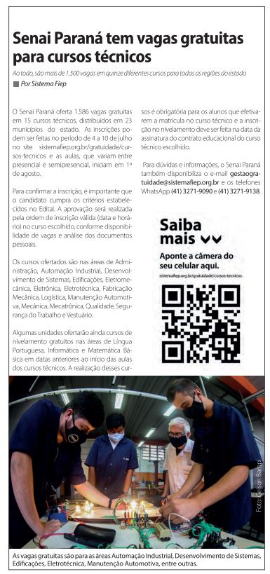 Senai Paraná tem vagas gratuitas para cursos técnicos