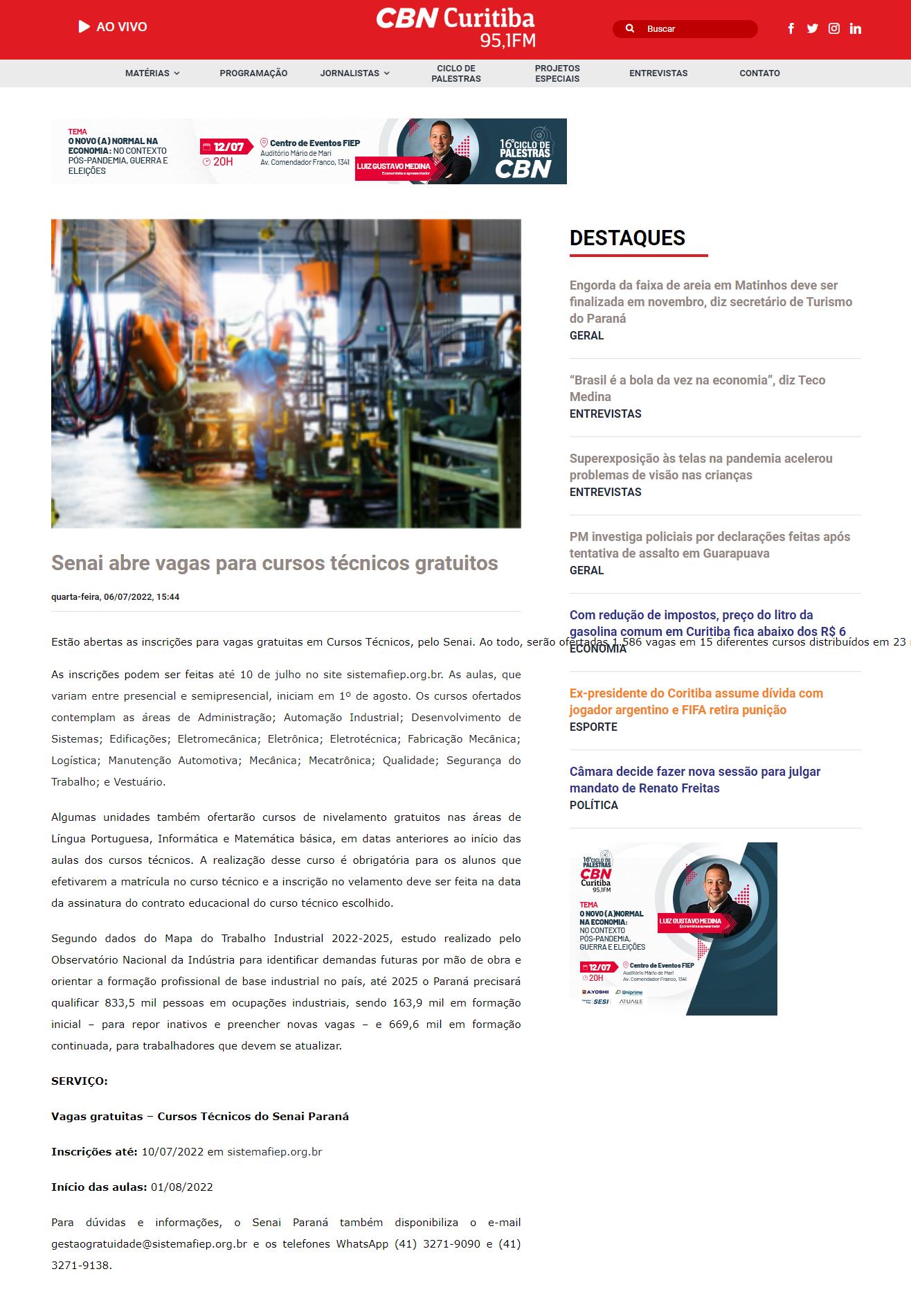 Senai ParanáInscrições até: 10/07/2022 em sistemafiep.org.br