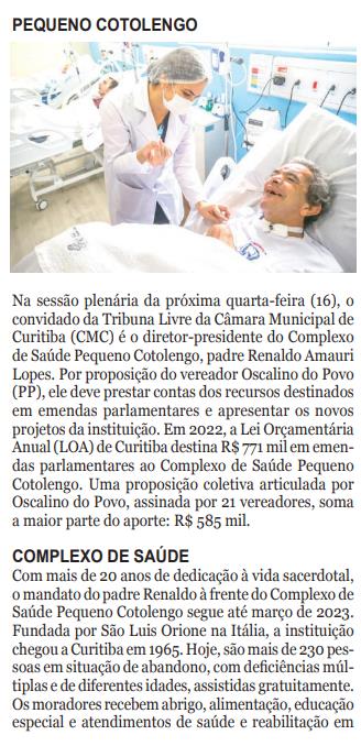 Na sessão plenária da próxima quarta-feira (16), o convidado da Tribuna Livre da Câmara Municipal de Curitiba (CMC) é o diretor-presidente do Complexo de Saúde Pequeno Cotolengo, padre Renaldo Amauri Lopes. Por proposição do vereador Oscalino do Povo (PP), ele deve prestar contas dos recursos destinados em emendas parlamentares e apresentar os novos projetos da instituição. Em 2022, a Lei Orçamentária Anual (LOA) de Curitiba destina R$ 771 mil em emendas parlamentares ao Complexo de Saúde Pequeno Cotolengo. Uma proposição coletiva articulada por Oscalino do Povo, assinada por 21 vereadores, soma a maior parte do aporte: R$ 585 mil.