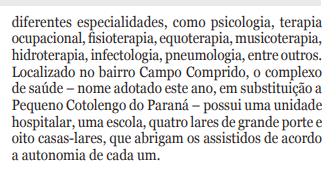 COMPLEXO DE SAÚDE Com mais de 20 anos de dedicação à vida sacerdotal, o mandato do padre Renaldo à frente do Complexo de Saúde Pequeno Cotolengo segue até março de 2023. Fundada por São Luis Orione na Itália, a instituição chegou a Curitiba em 1965. Hoje, são mais de 230 pessoas em situação de abandono, com deficiências múltiplas e de diferentes idades, assistidas gratuitamente. Os moradores recebem abrigo, alimentação, educação especial e atendimentos de saúde e reabilitação em diferentes especialidades, como psicologia, terapia ocupacional, fisioterapia, equoterapia, musicoterapia, hidroterapia, infectologia, pneumologia, entre outros. Localizado no bairro Campo Comprido, o complexo de saúde - nome adotado este ano, em substituição a Pequeno Cotolengo do Paraná - possui uma unidade hospitalar, uma escola, quatro lares de grande porte e oito casas-lares, que abrigam os assistidos de acordo a autonomia de cada um.