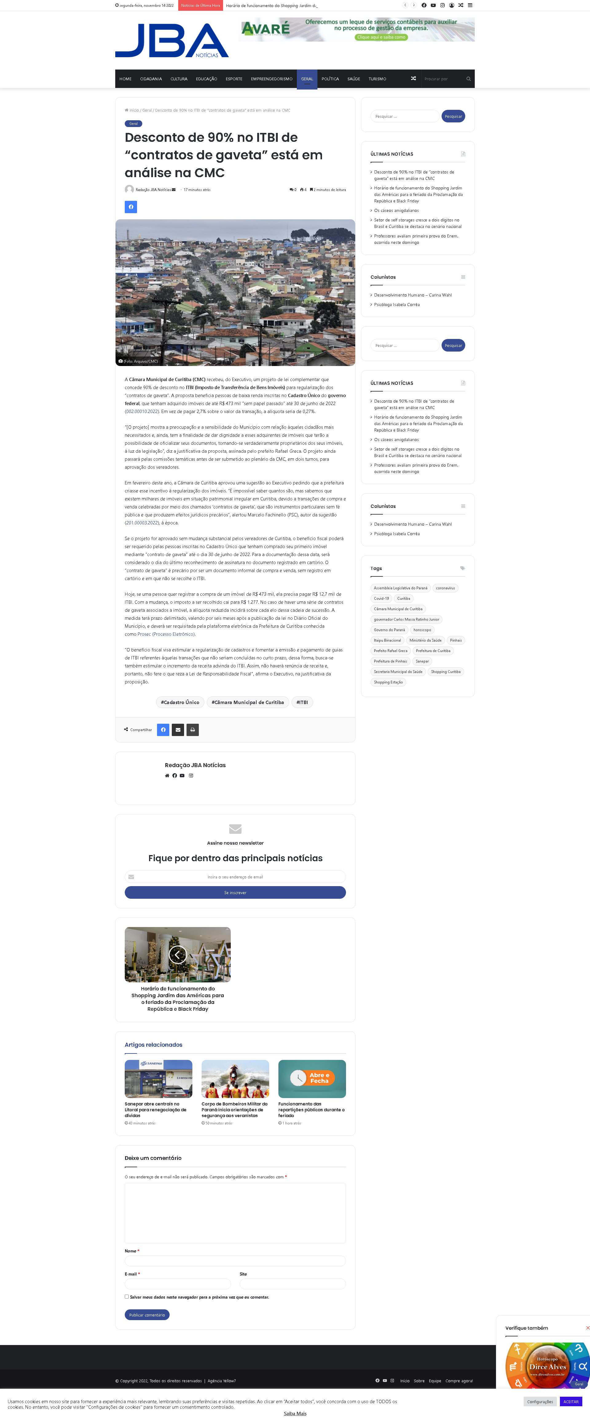 Câmara Municipal de Curitiba (CMC) recebeu, do Executivo, um projeto de lei complementar que concede 90% de desconto no ITBI (Imposto de Transferência de Bens Imóveis) para regularização dos “contratos de gaveta”. A proposta beneficia pessoas de baixa renda inscritas no Cadastro Único do governo federal, que tenham adquirido imóveis de até R$ 473 mil “sem papel passado” até 30 de junho de 2022 (002.00010.2022). Em vez de pagar 2,7% sobre o valor da transação, a alíquota seria de 0,27%.