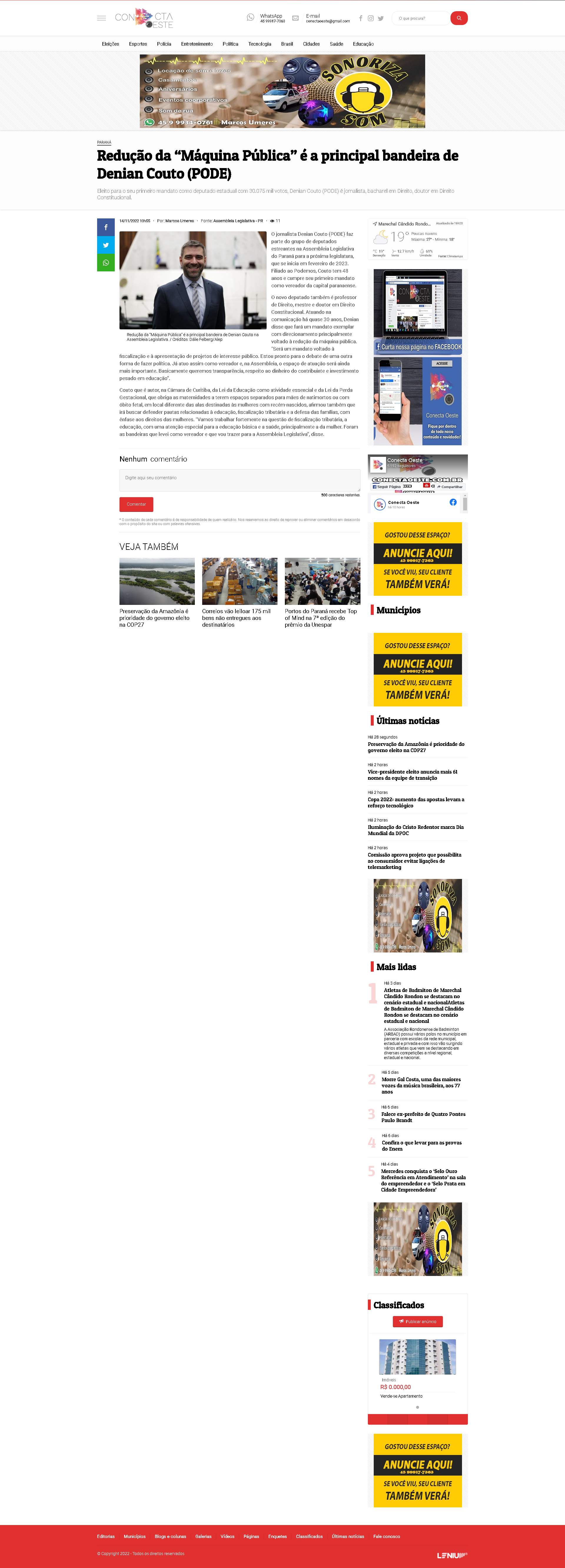 vereador da capital paranaense. O novo deputado também é professor de Direito, mestre e doutor em Direito Constitucional. Atuando na comunicação há quase 30 anos, Denian disse que fará um mandato exemplar com direcionamento principalmente voltado à redução da máquina pública. “Será um mandato voltado à fiscalização e à apresentação de projetos de interesse público. Estou pronto para o debate de uma outra forma de fazer política. Já atuo assim como vereador e, na Assembleia, o espaço de atuação será ainda mais importante. Basicamente queremos transparência, respeito ao dinheiro do contribuinte e investimento pesado em educação”. Couto que é autor, na