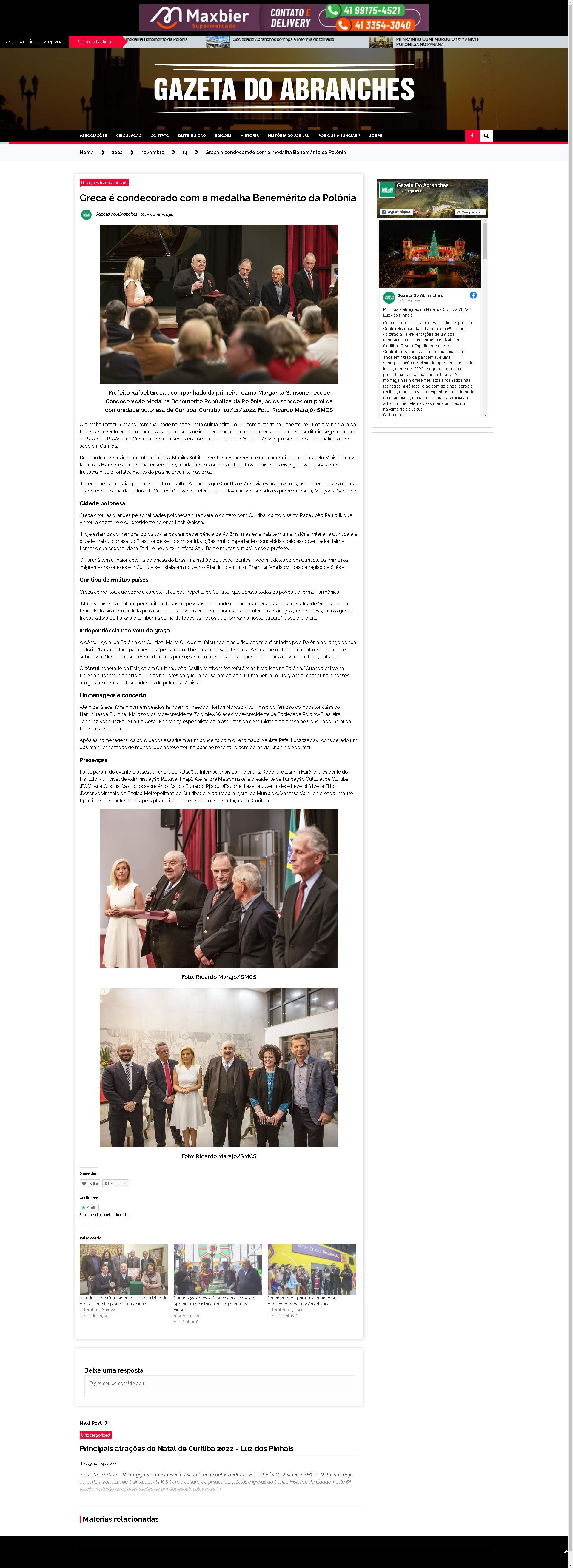 O prefeito Rafael Greca foi homenageado na noite desta quinta-feira (10/11) com a medalha Benemérito, uma alta honraria da Polônia. O evento em comemoração aos 104 anos de independência do país europeu aconteceu no Auditório Regina Casillo do Solar do Rosário, no Centro, com a presença do corpo consular polonês e de várias representações diplomáticas com sede em Curitiba.