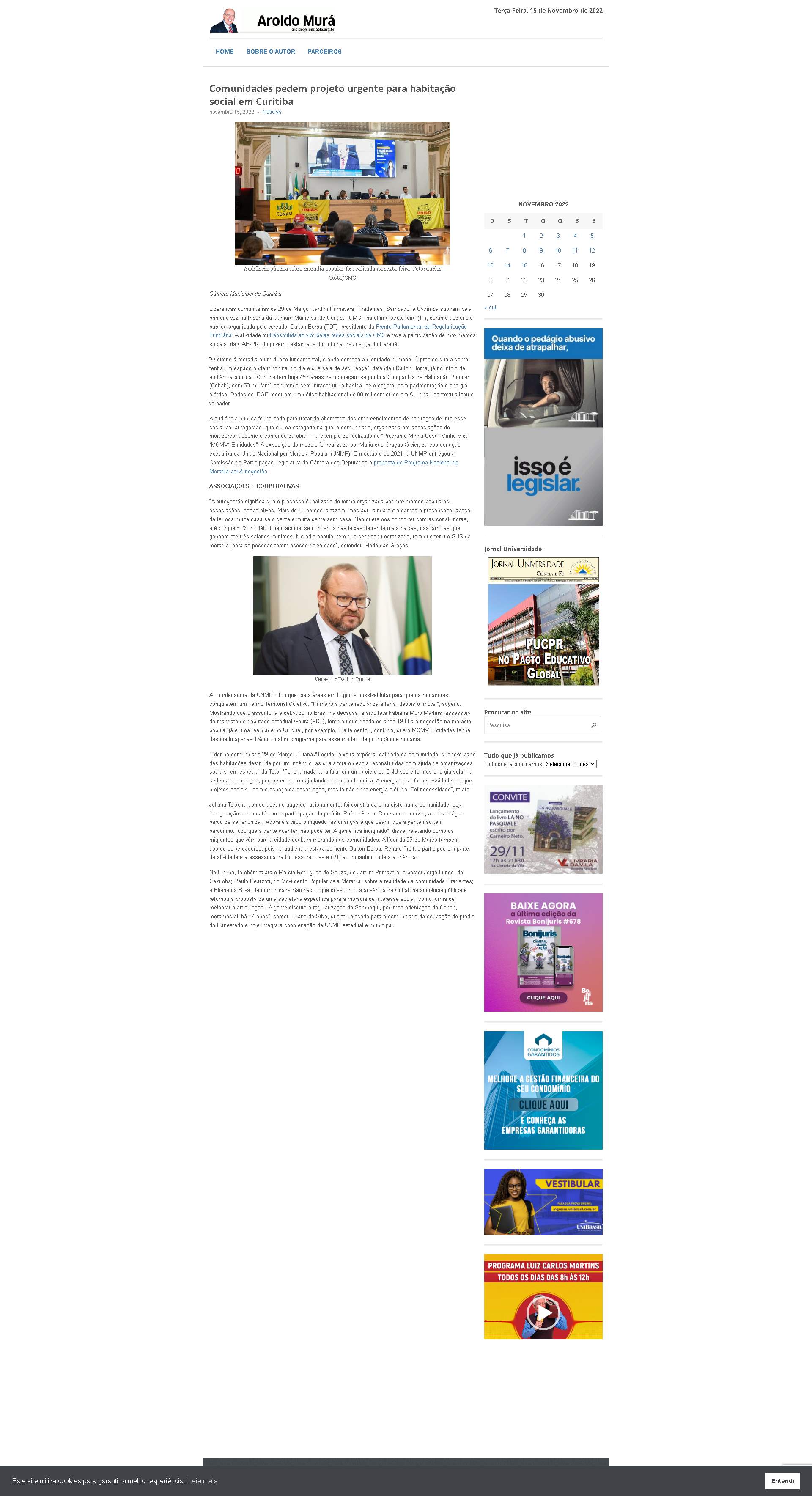 Na tribuna, também falaram Márcio Rodrigues de Souza, do Jardim Primavera; o pastor Jorge Lunes, do Caximba; Paulo Bearzoti, do Movimento Popular pela Moradia, sobre a realidade da comunidade Tiradentes; e Eliane da Silva, da comunidade Sambaqui, que questionou a ausência da Cohab na audiência pública e retomou a proposta de uma secretaria específica para a moradia de interesse social, como forma de melhorar a articulação. “A gente discute a regularização da Sambaqui, pedimos orientação da Cohab, moramos ali há 17 anos”, contou Eliane da Silva, que foi relocada para a comunidade da ocupação do prédio do Banestado e hoje integra a coordenação da UNMP estadual e municipal.