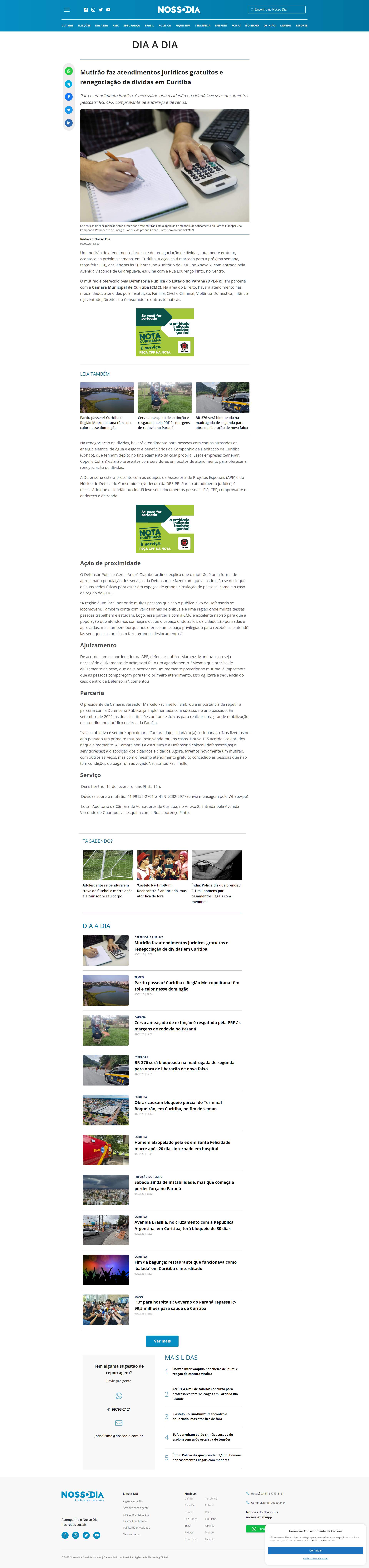 Um mutirão de atendimento jurídico e de renegociação de dívidas, totalmente gratuito, acontece na próxima semana, em Curitiba. A ação está marcada para a próxima semana, terça-feira (14), das 9 horas às 16 horas, no Auditório da CMC, no Anexo 2, com entrada pela Avenida Visconde de Guarapuava, esquina com a Rua Lourenço Pinto, no Centro.