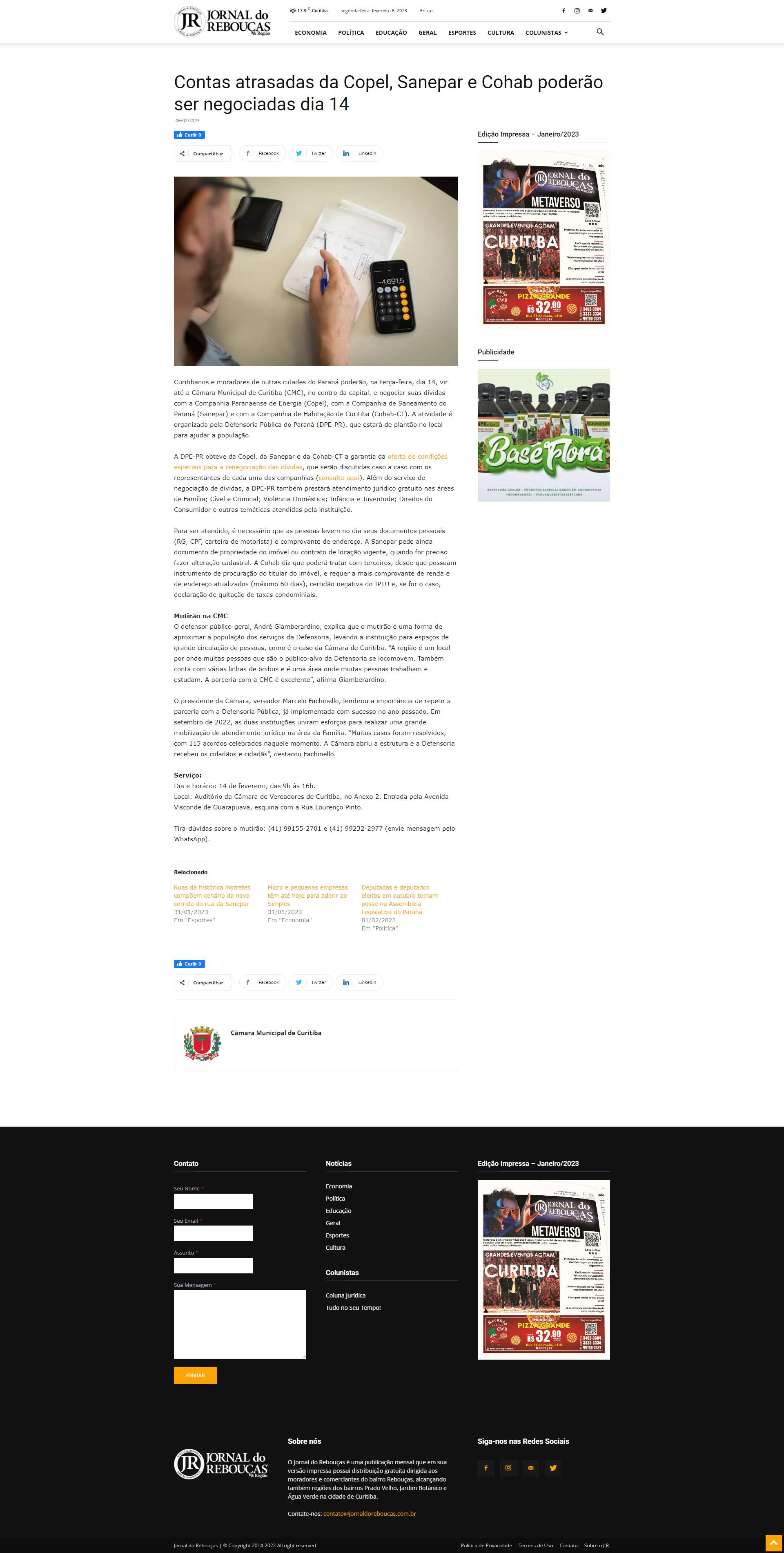 Curitibanos e moradores de outras cidades do Paraná poderão, na terça-feira, dia 14, vir até a Câmara Municipal de Curitiba (CMC), no centro da capital, e negociar suas dívidas com a Companhia Paranaense de Energia (Copel), com a Companhia de Saneamento do Paraná (Sanepar) e com a Companhia de Habitação de Curitiba (Cohab-CT). A atividade é organizada pela Defensoria Pública do Paraná (DPE-PR), que estará de plantão no local para ajudar a população.