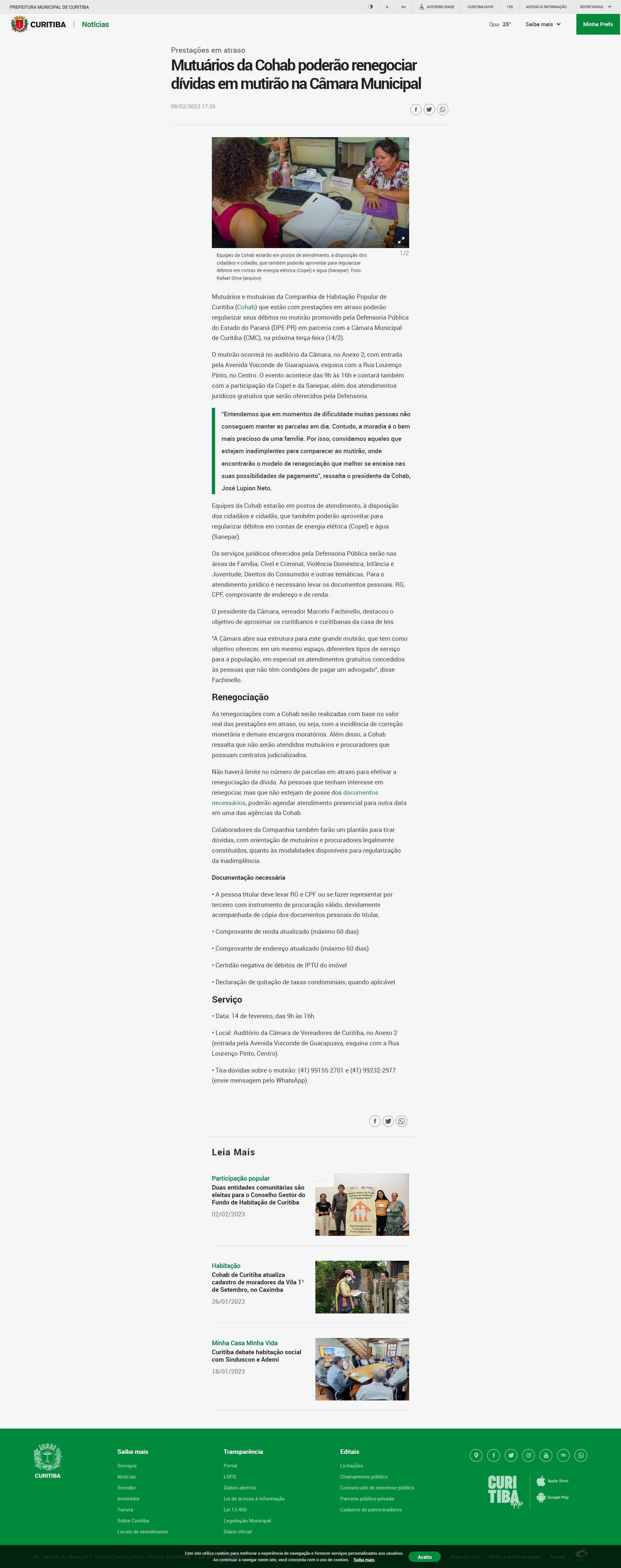Mutuários e mutuárias da Companhia de Habitação Popular de Curitiba (Cohab) que estão com prestações em atraso poderão regularizar seus débitos no mutirão promovido pela Defensoria Pública do Estado do Paraná (DPE-PR) em parceria com a Câmara Municipal de Curitiba (CMC), na próxima terça-feira (14/2).