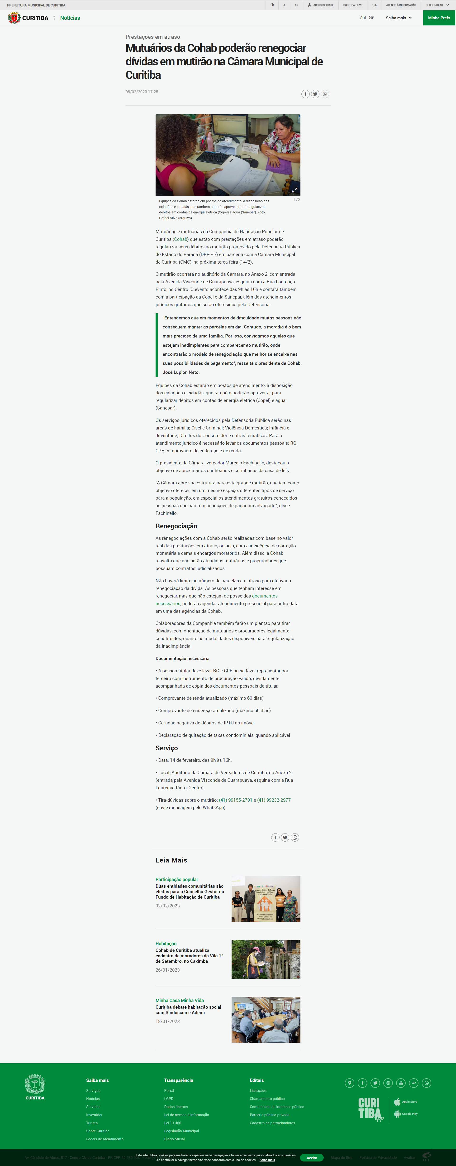 Mutuários e mutuárias da Companhia de Habitação Popular de Curitiba (Cohab) que estão com prestações em atraso poderão regularizar seus débitos no mutirão promovido pela Defensoria Pública do Estado do Paraná (DPE-PR) em parceria com a Câmara Municipal de Curitiba (CMC), na próxima terça-feira (14/2).