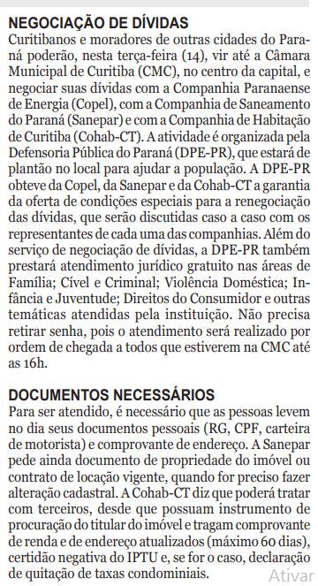 Curitibanos e moradores de outras cidades do Paraná poderão, nesta terça-feira (14), vir até a Câmara Municipal de Curitiba (CMC), no centro da capital, e negociar suas dívidas com a Companhia Paranaense de Energia (Copel), com a Companhia de Saneamento do Paraná (Sanepar) e com a Companhia de Habitação de Curitiba (Cohab-CT). A atividade é organizada pela Defensoria Pública do Paraná (DPE-PR), que estará de plantão no local para ajudar a população. A DPE-PR obteve da Copel, da Sanepar e da Cohab-CT a garantia da oferta de condições especiais para a renegociação das dívidas, que serão discutidas caso a caso com os representantes de cada uma das companhias. Além do serviço de negociação de dívidas, a DPE-PR também prestará atendimento jurídico gratuito nas áreas de Família; Cível e Criminal; Violência Doméstica; Infância e Juventude; Direitos do Consumidor e outras temáticas atendidas pela instituição. Não precisa retirar senha, pois o atendimento será realizado por ordem de chegada a todos que estiverem na CMC até as 16h.