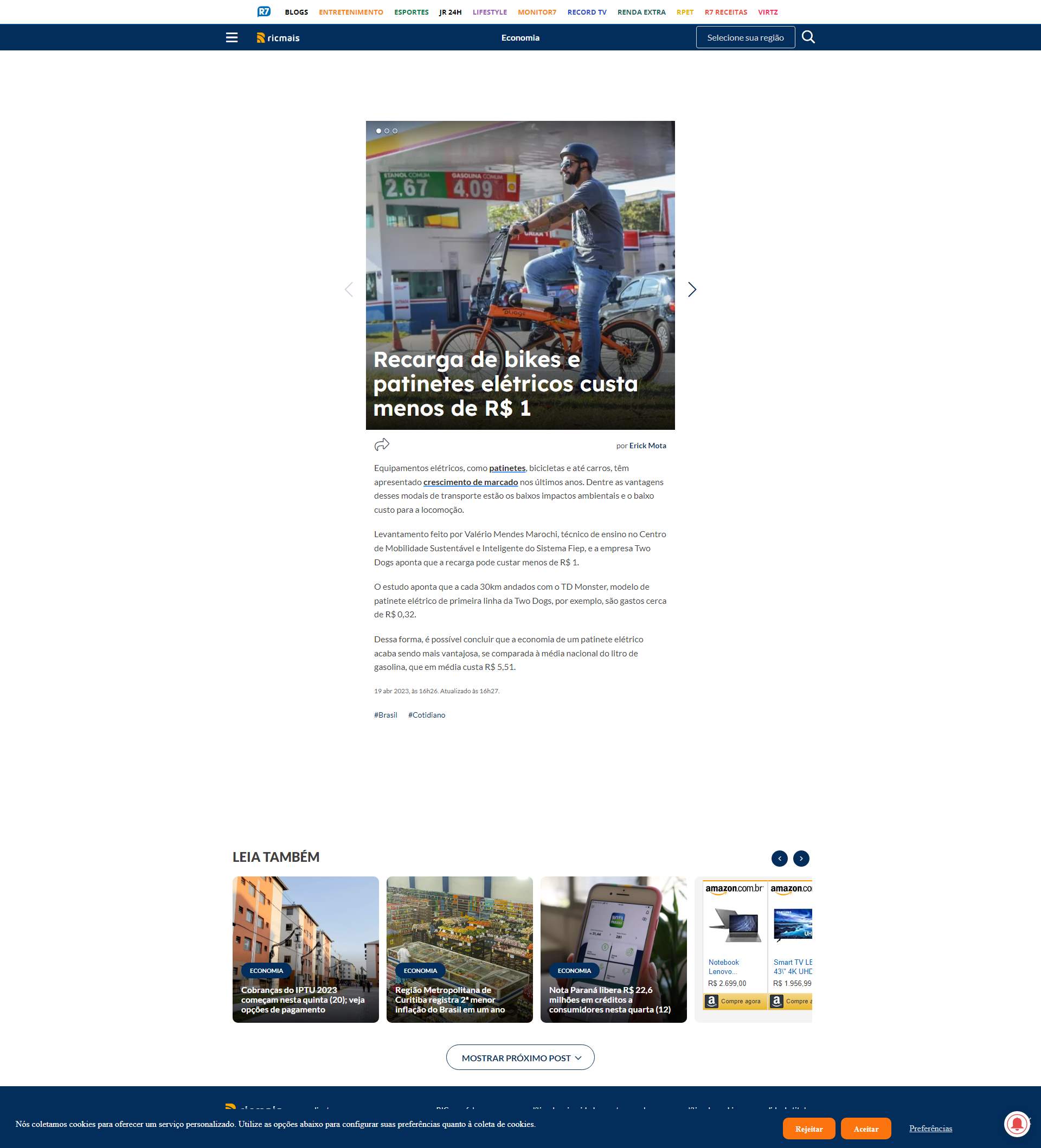 Recarga de bikes e patinetes elétricos custa menos de R$ 1