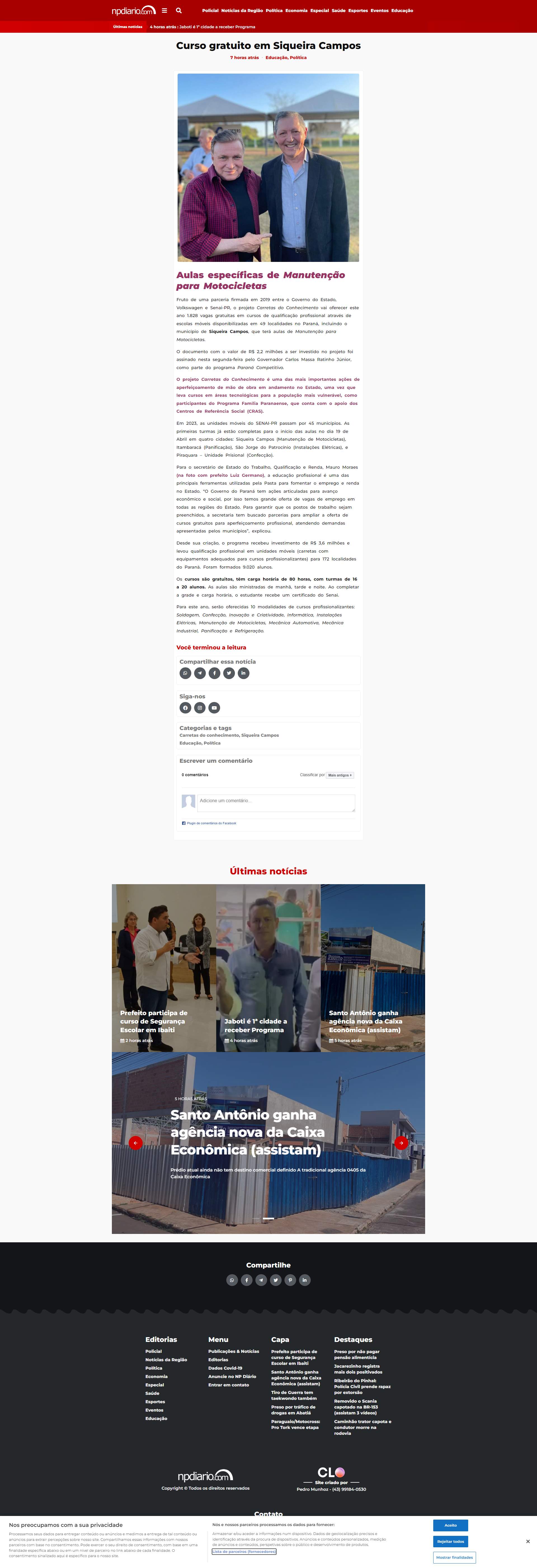 Paraná, incluindo o município de Siqueira Campos, que terá aulas de Manutenção para Motocicletas.