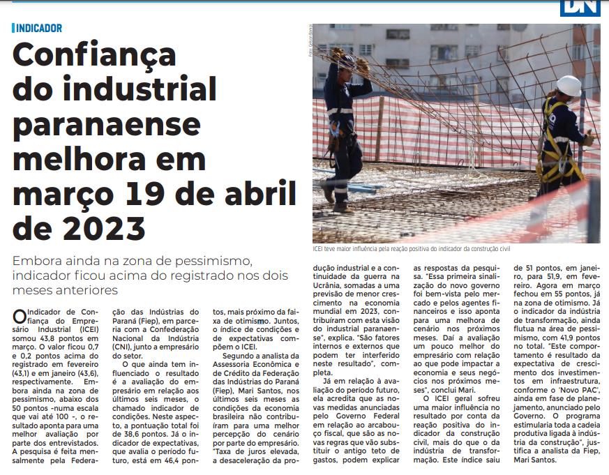 Confiança do industrial paranaense melhora em março 19 de abril de 2023