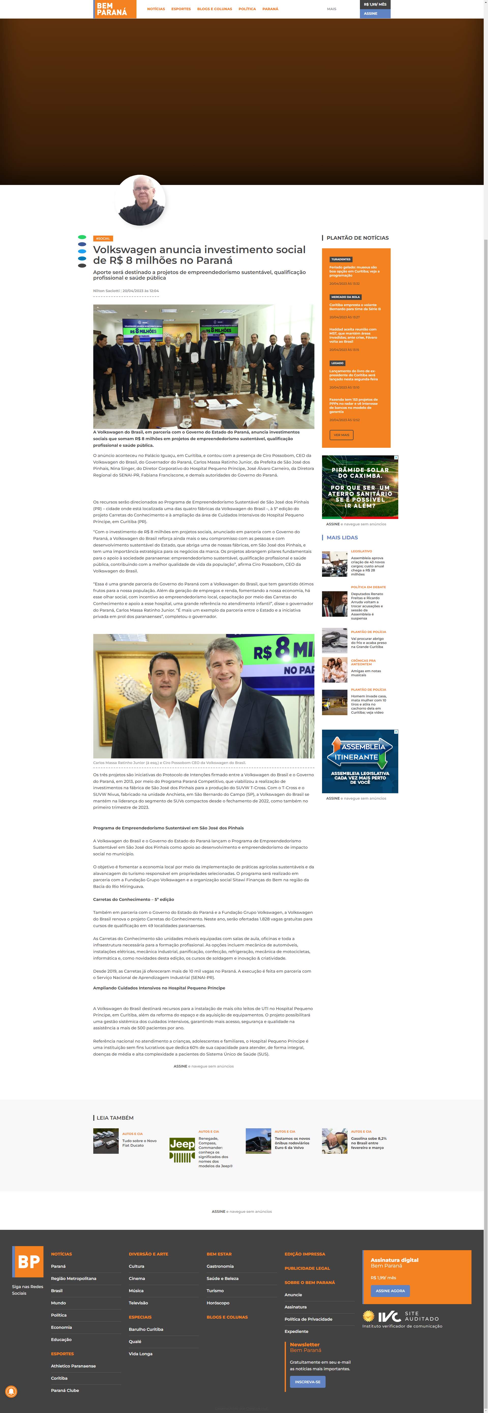Paraná, a Volkswagen do Brasil reforça ainda mais o seu compromisso com as pessoas e com desenvolvimento sustentável do Estado, que abriga uma de nossas fábricas, em São José dos Pinhais, e tem uma importância estratégica para os negócios da marca. Os projetos abrangem pilares fundamentais para o apoio à sociedade paranaense: empreendedorismo sustentável, qualificação profissional e saúde pública, contribuindo com a melhor qualidade de vida da população”, afirma Ciro Possobom, CEO da Volkswagen do Brasil.