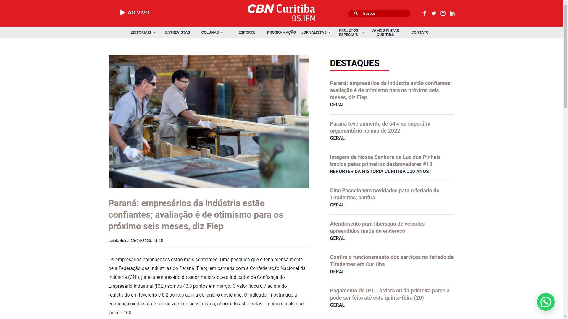 Federação das Indústrias do Paraná (Fiep), em parceria com a Confederação Nacional da Indústria (CNI), junto a empresário do setor, mostra que o Indicador de Confiança do Empresário Industrial (ICEI) somou 43,8 pontos em março. O valor ficou 0,7 acima do registrado em fevereiro e 0,2 pontos acima de janeiro deste ano. O indicador mostra que a confiança ainda está em uma zona de pessimismo, abaixo dos 50 pontos – numa escala que vai até 100.