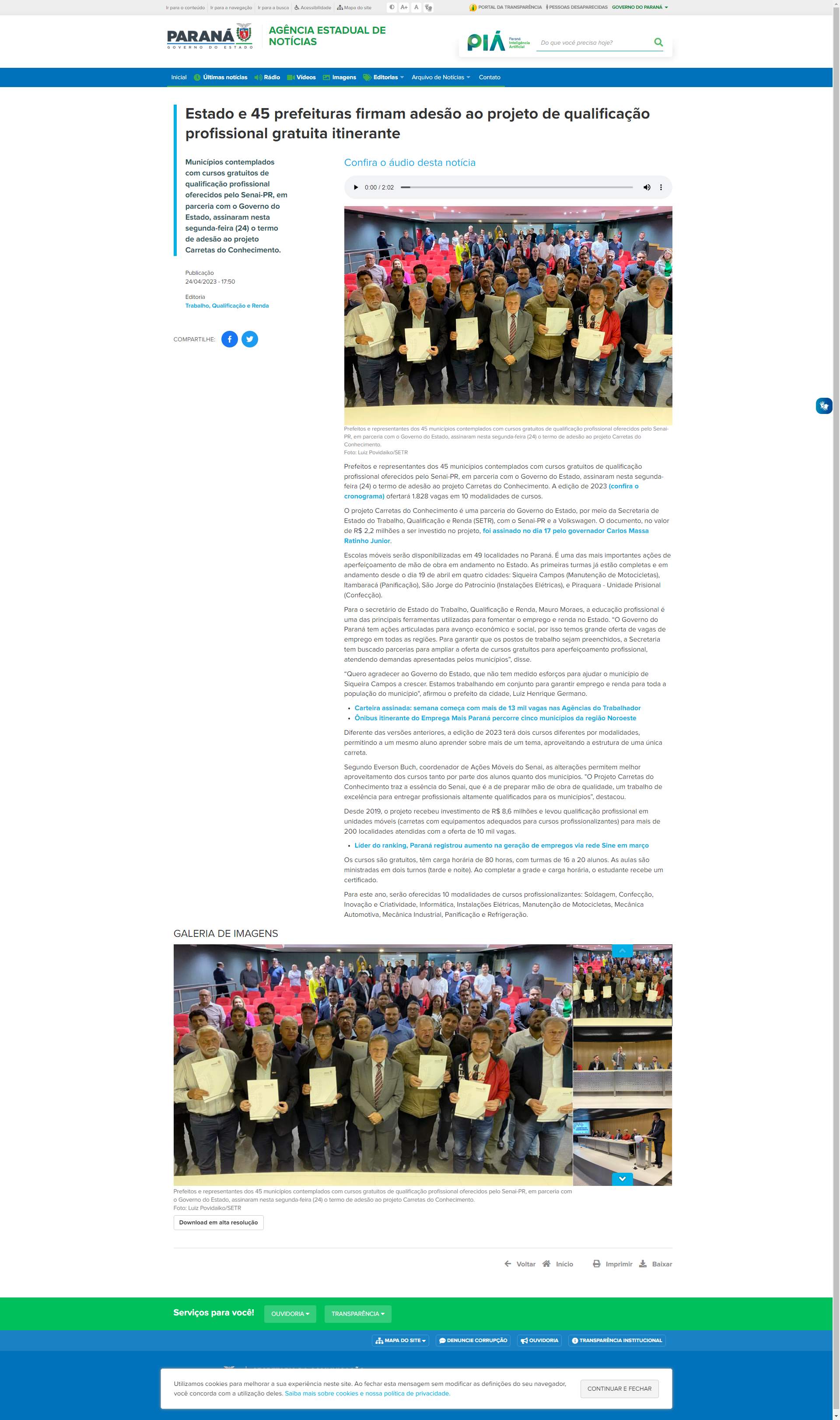 Paraná. É uma das mais importantes ações de aperfeiçoamento de mão de obra em andamento no Estado. As primeiras turmas já estão completas e em andamento desde o dia 19 de abril em quatro cidades: Siqueira Campos (Manutenção de Motocicletas), Itambaracá (Panificação), São Jorge do Patrocínio (Instalações Elétricas), e Piraquara - Unidade Prisional (Confecção).