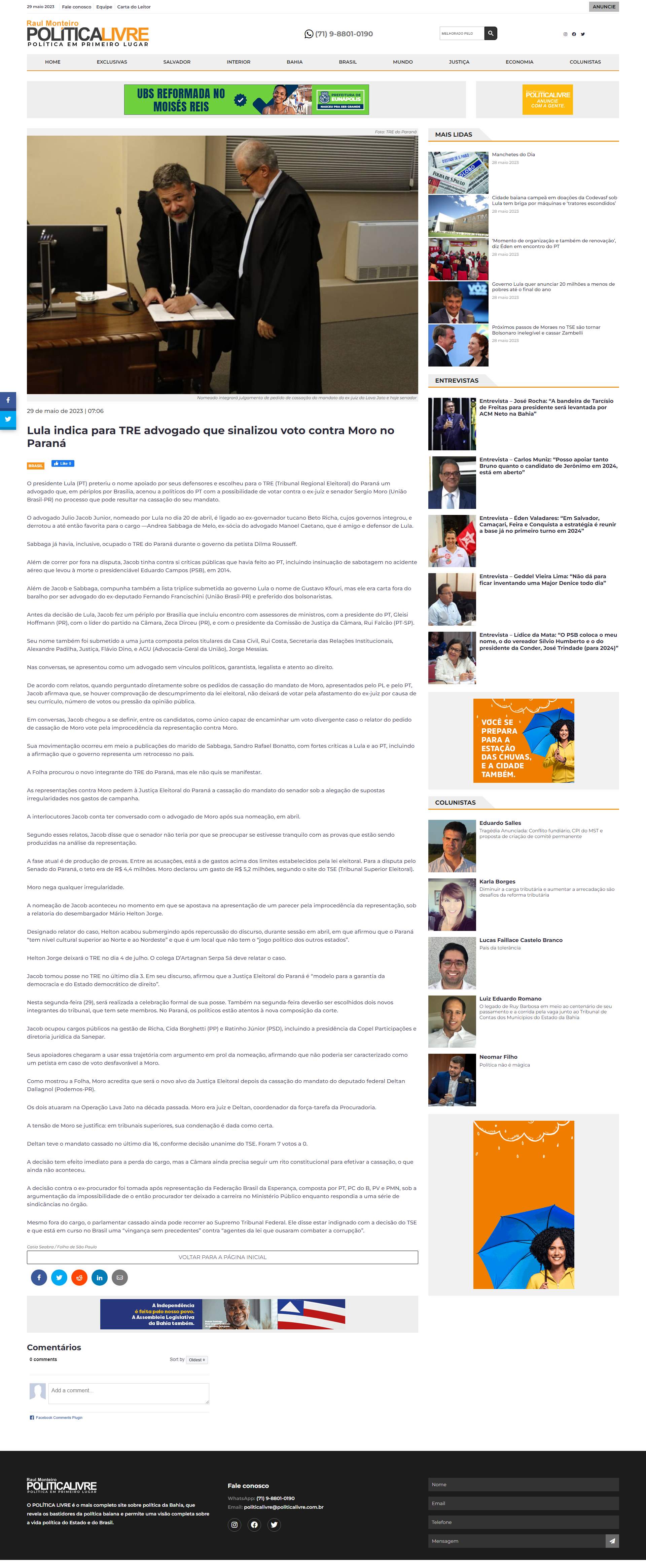 Como mostrou a Folha, Moro acredita que será o novo alvo da Justiça Eleitoral depois da cassação do mandato do deputado federal Deltan Dallagnol (Podemos-PR).