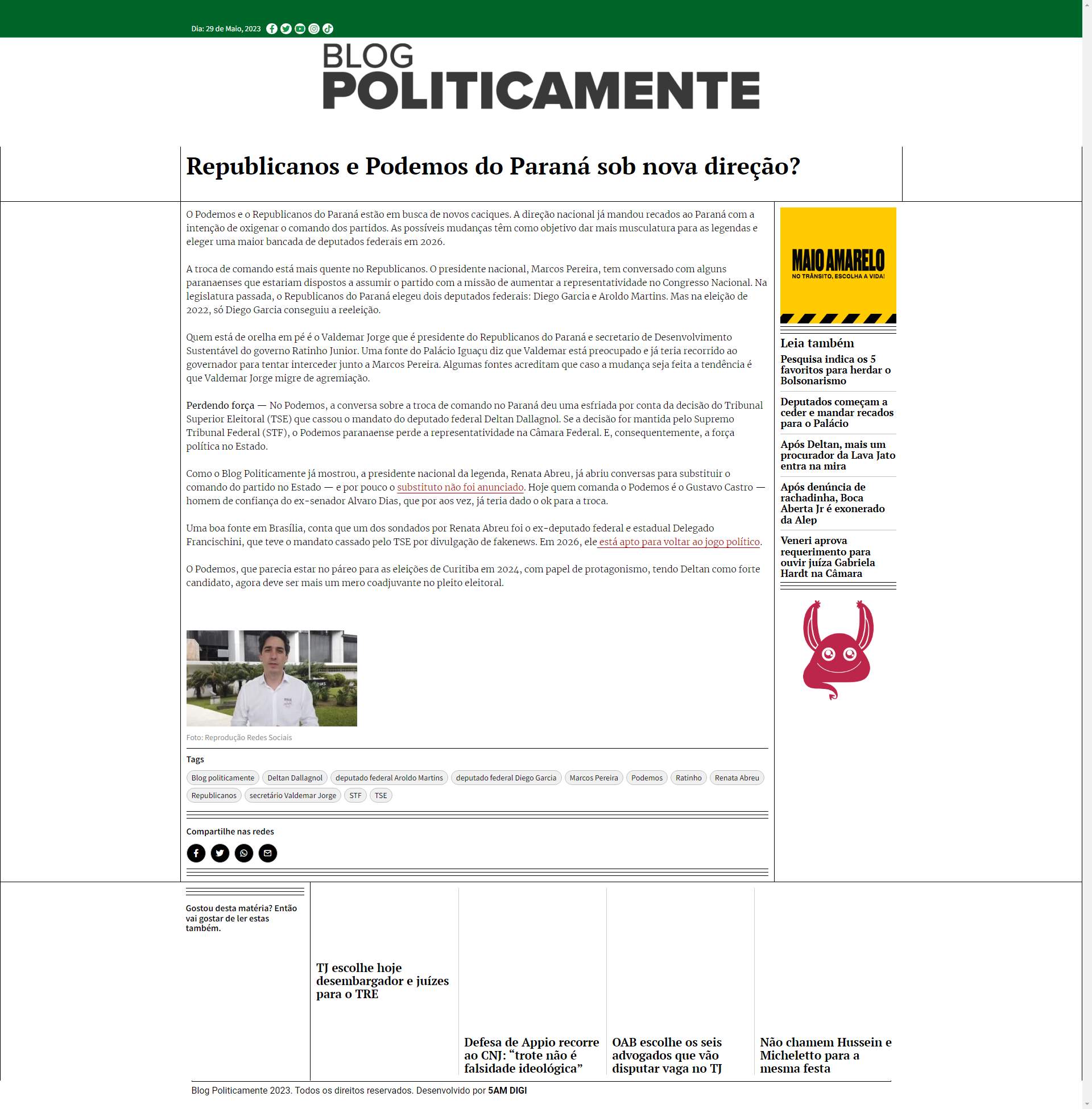 O Podemos, que parecia estar no páreo para as eleições de Curitiba em 2024, com papel de protagonismo, tendo Deltan como forte candidato, agora deve ser mais um mero coadjuvante no pleito eleitoral.
