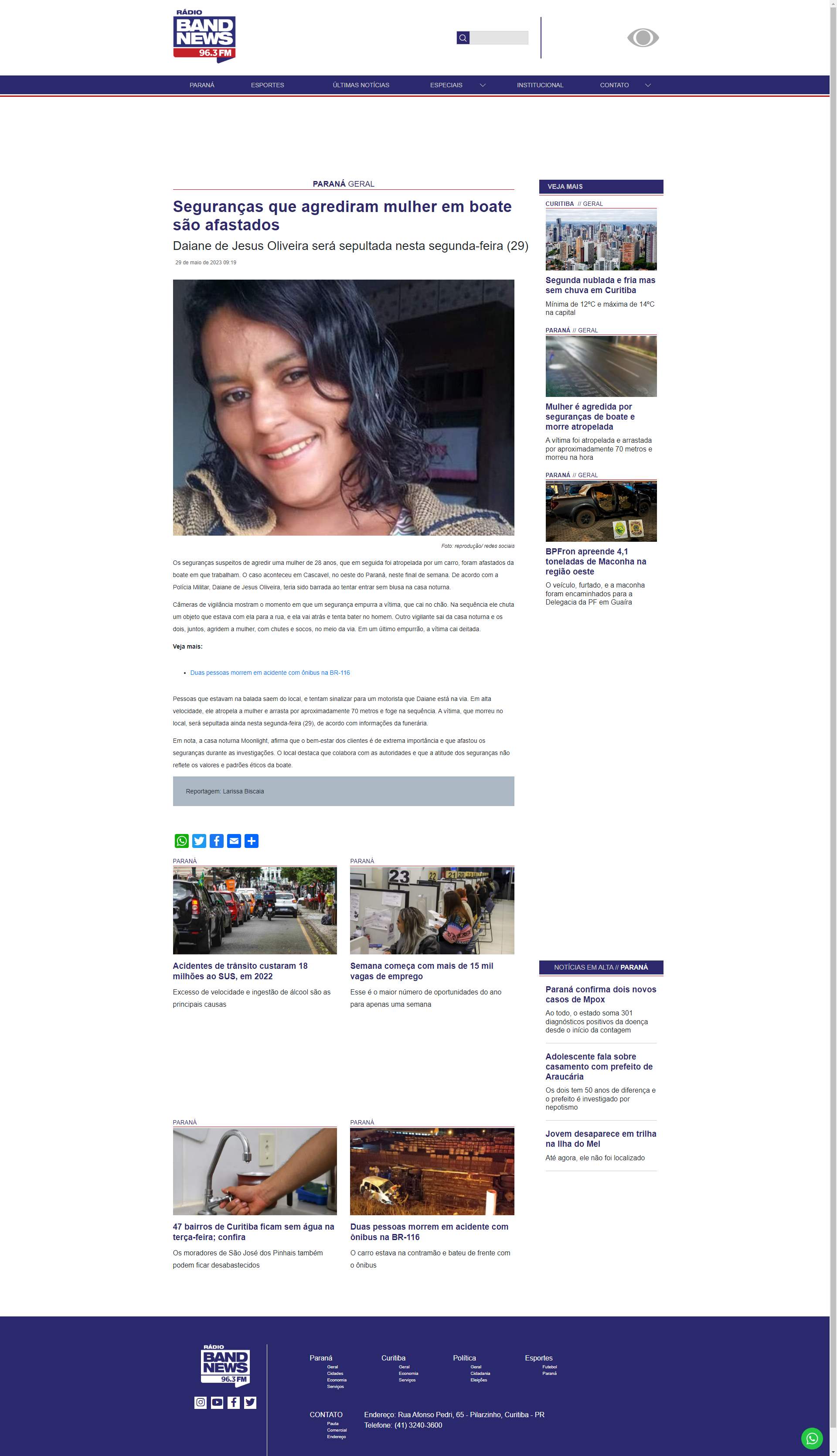 Pessoas que estavam na balada saem do local, e tentam sinalizar para um motorista que Daiane está na via. Em alta velocidade, ele atropela a mulher e arrasta por aproximadamente 70 metros e foge na sequência. A vítima, que morreu no local, será sepultada ainda nesta segunda-feira (29), de acordo com informações da funerária.