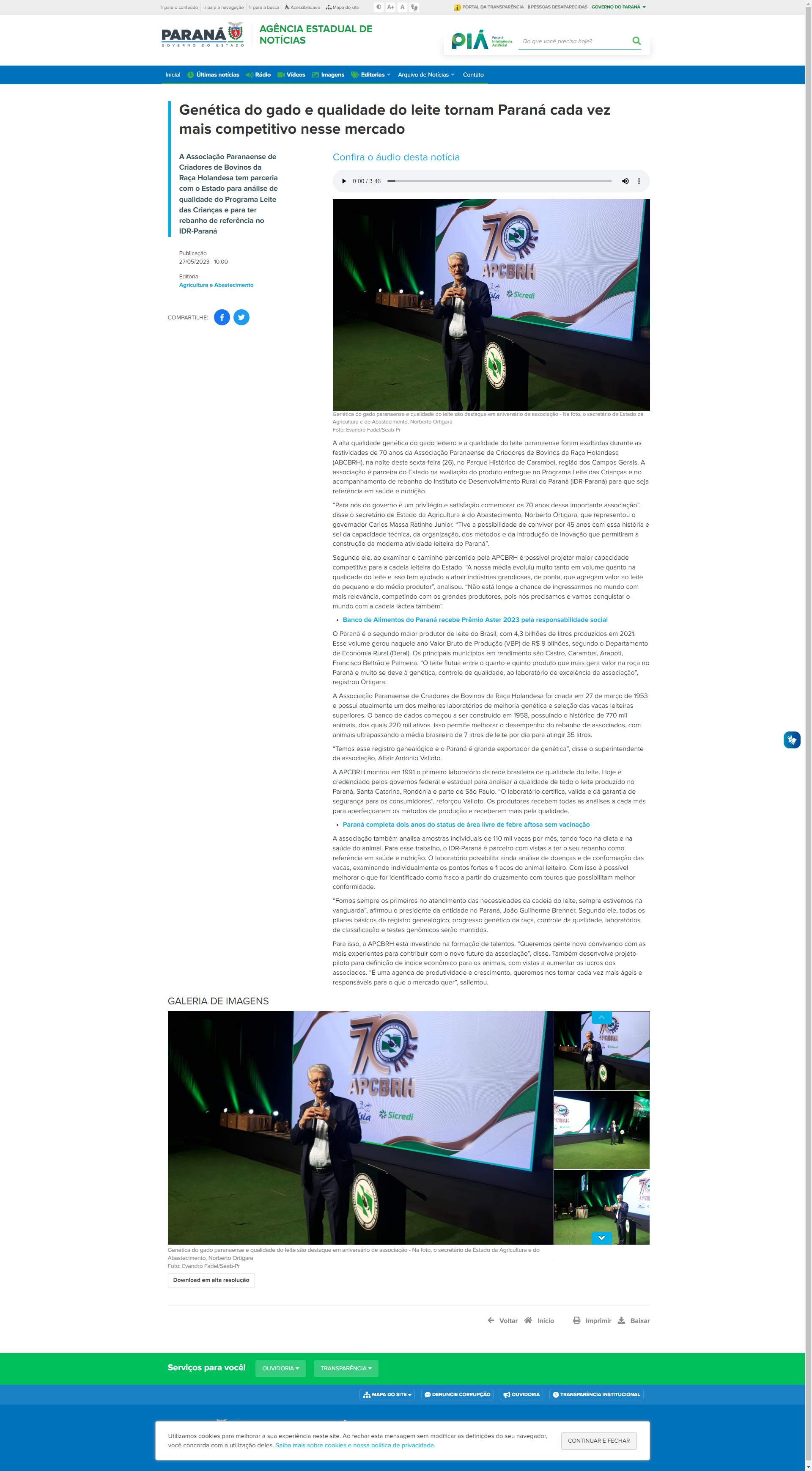 A alta qualidade genética do gado leiteiro e a qualidade do leite paranaense foram exaltadas durante as festividades de 70 anos da Associação Paranaense de Criadores de Bovinos da Raça Holandesa (ABCBRH), na noite desta sexta-feira (26), no Parque Histórico de Carambeí, região dos Campos Gerais. A associação é parceira do Estado na avaliação do produto entregue no Programa Leite das Crianças e no acompanhamento de rebanho do Instituto de Desenvolvimento Rural do Paraná (IDR-Paraná) para que seja referência em saúde e nutrição.