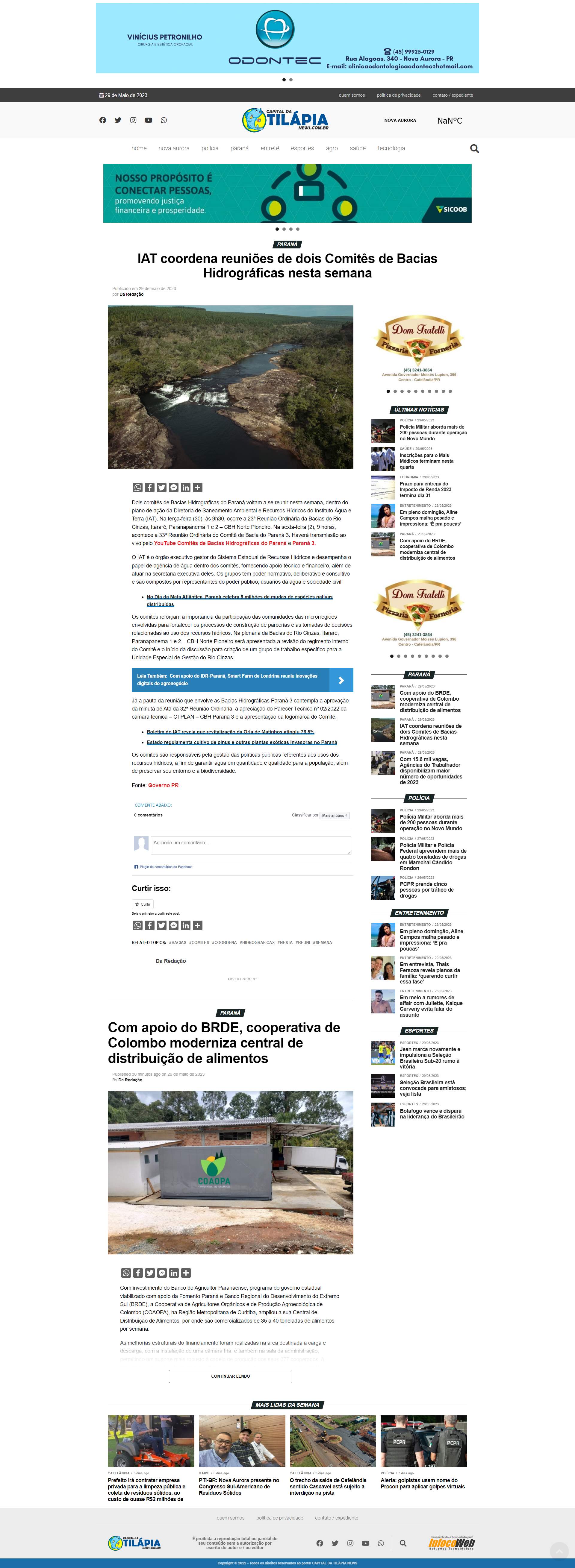 Instituto Água e Terra (IAT). Na terça-feira (30), às 9h30, ocorre a 23ª Reunião Ordinária da Bacias do Rio Cinzas, Itararé, Paranapanema 1 e 2 - CBH Norte Pioneiro. Na sexta-feira (2), 9 horas, acontece a 33ª Reunião Ordinária do Comitê de Bacia do